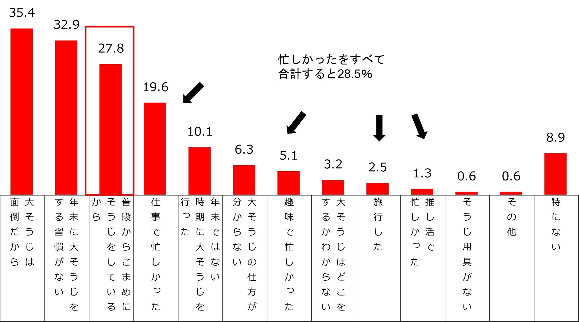年末大そうじを行わなかった理由は、「大そうじは面倒だから」が最も多く35.4%。次いで、「年末に大そうじをする習慣がない」が32.9%、「仕事 / 趣味 / 推し活 / 旅行 等で忙しかった」が28.5%、「普段からこまめにそうじをしているから」が27.8% という結果になりました。