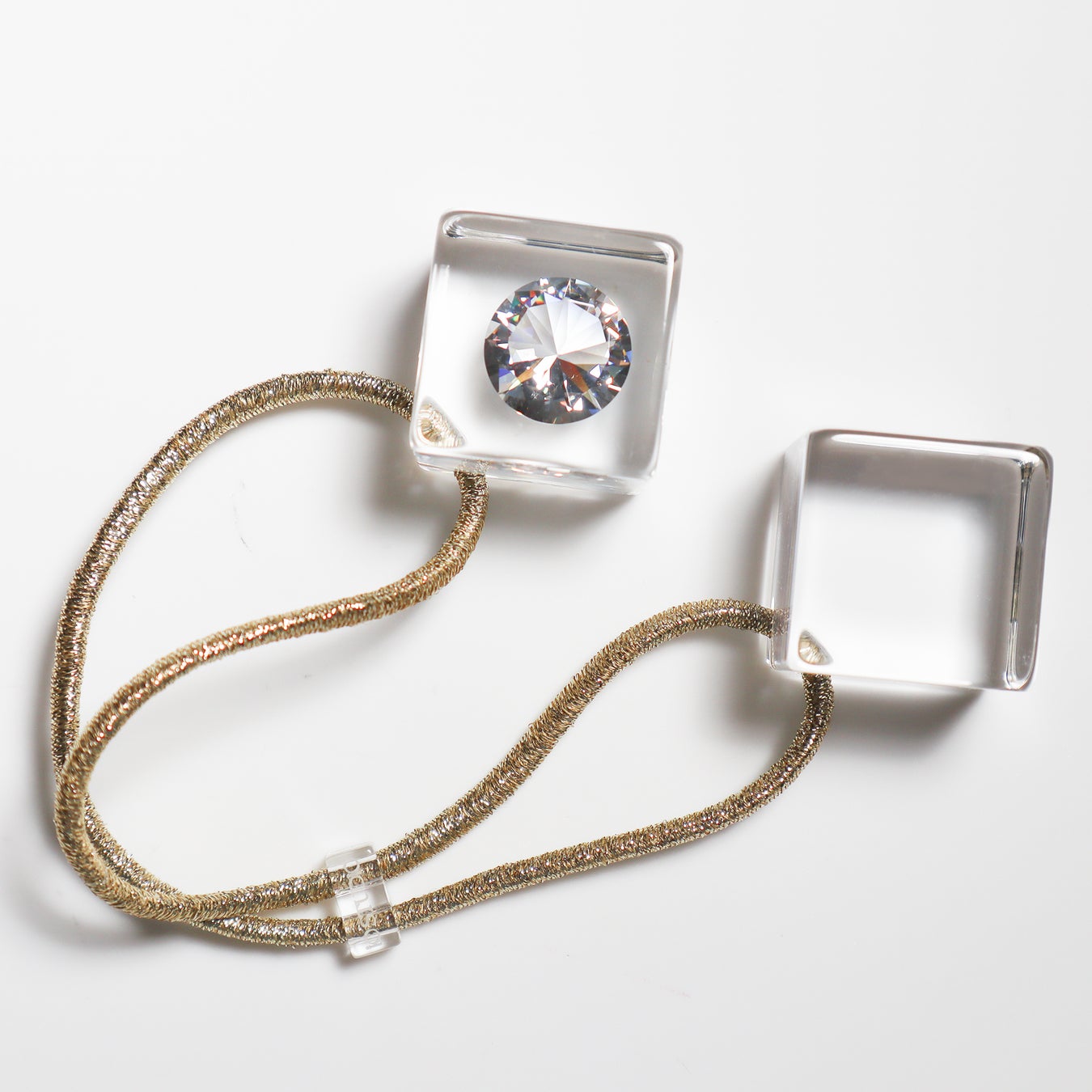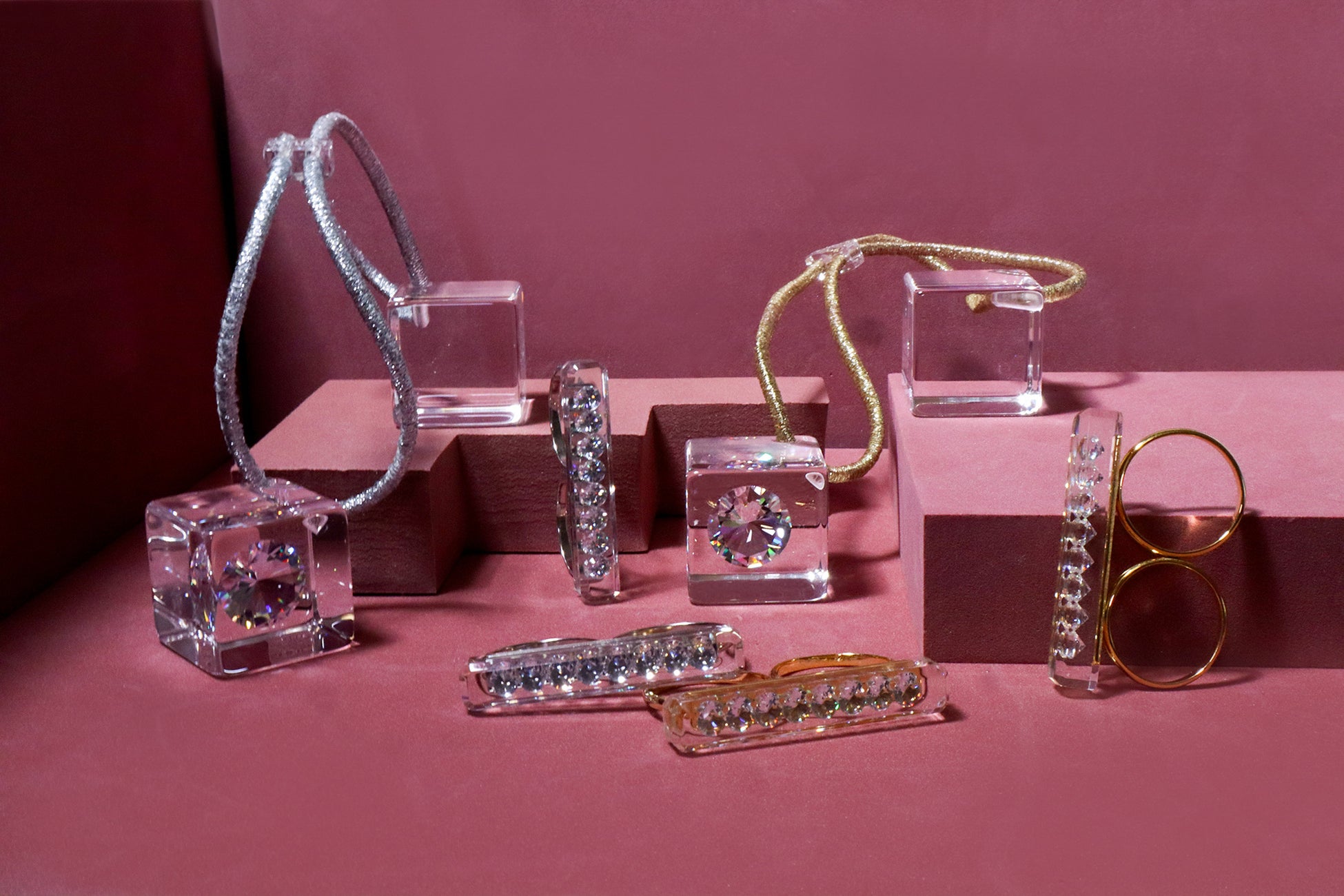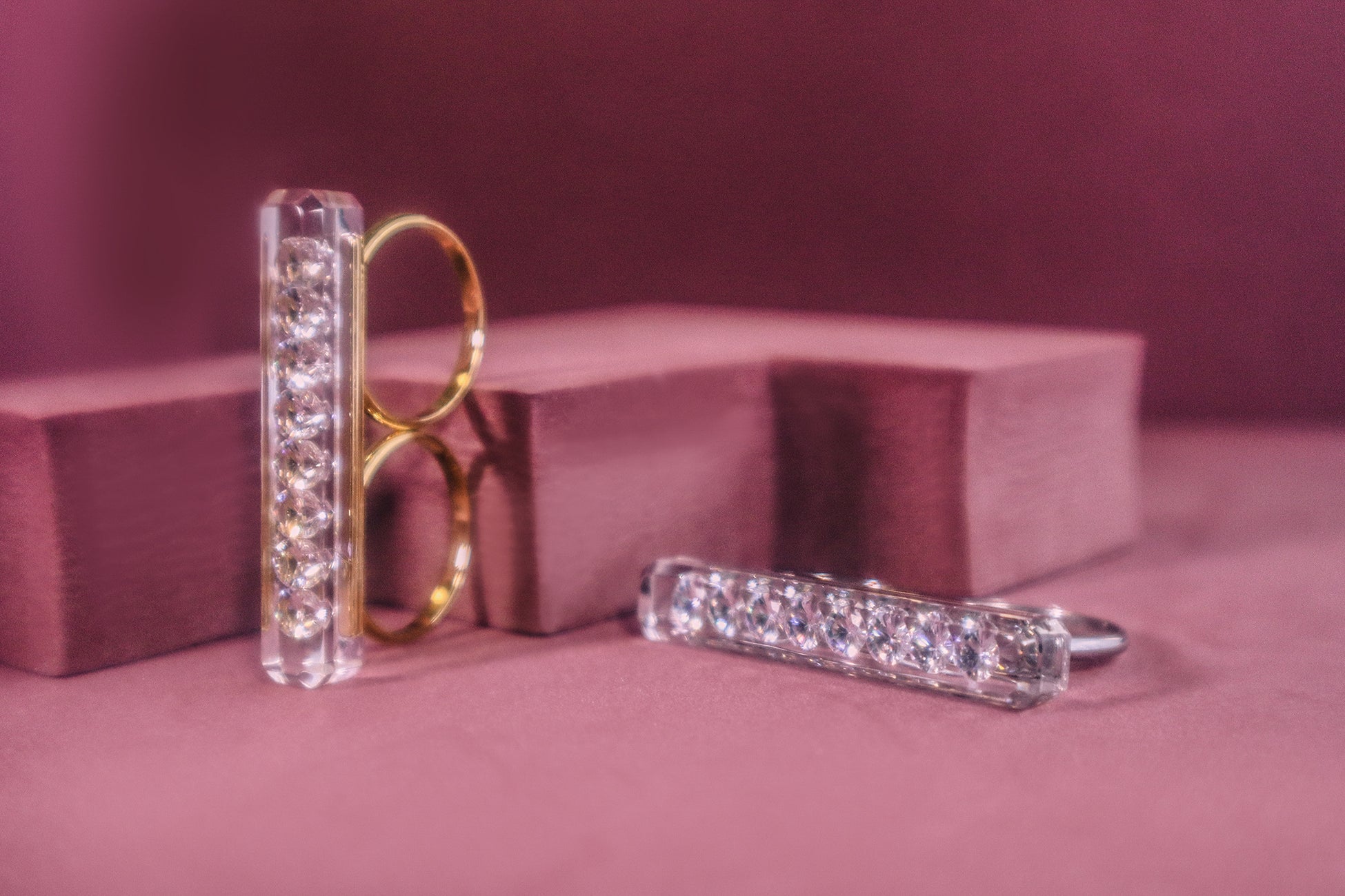 iOstudioの商品では、通常金属に埋まっていて全容を見る事が叶わない、美しいストーンのカットを360度味わう事ができます。透明素材や宝石に光が差し込む際に発生する、7色の美しいディスパージョン(分散光)が、皆様の脳裏にも湧き起こるような商品をお届けします。