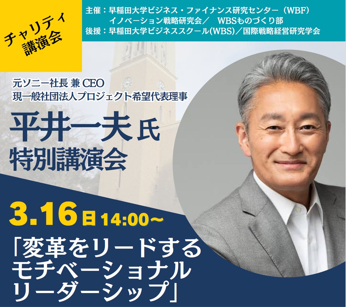 早稲田大学大学院経営管理研究科(通称:早稲田大学ビジネススクール、研究科長: 池上重輔)の「WBSものづくり部」は、早稲田大学ビジネス・ファイナンス研究センター イノベーション戦略研究部会と共催で3月16日に一般社団法人プロジェクト希望代表理事/元ソニー社長兼CEOの平井一夫氏をお招きして特別チャリティー講演会を開催します。