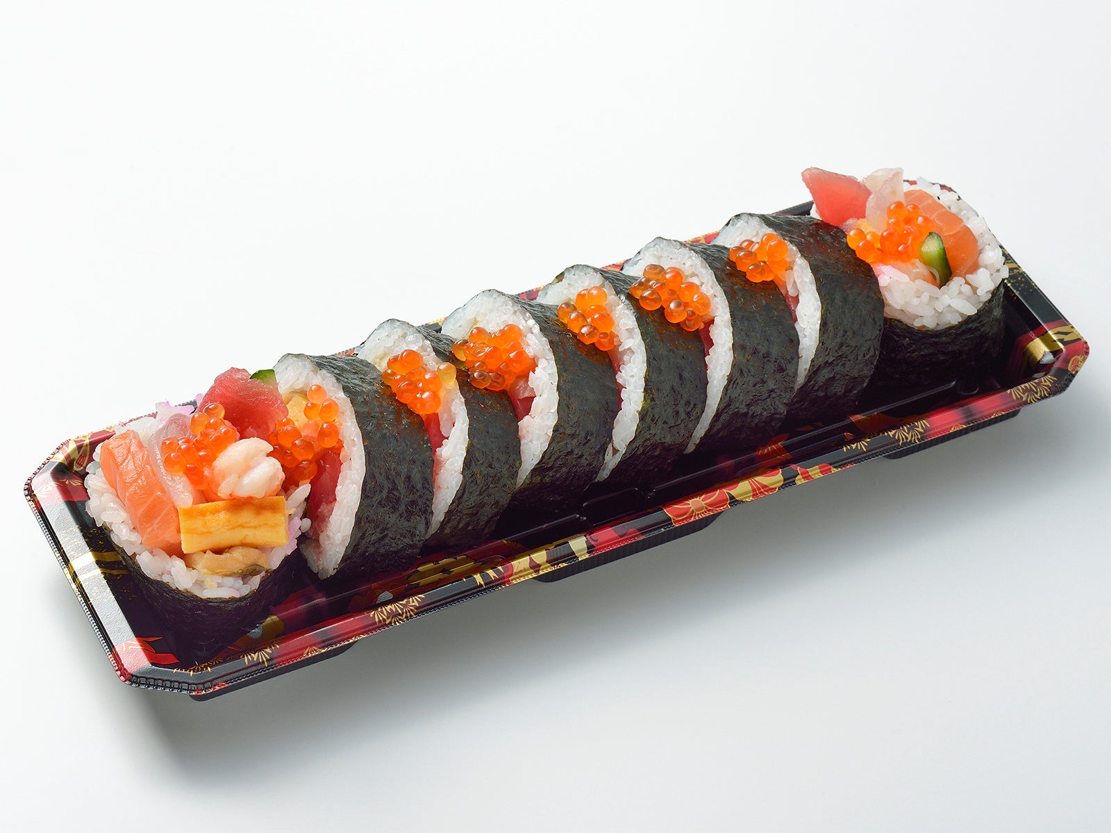 まぐろ、サーモン、白身、いくら、煮あなご、蒸しえび など海鮮をたっぷりと巻き込んだ、お祝いにぴったりの巻き寿司です。