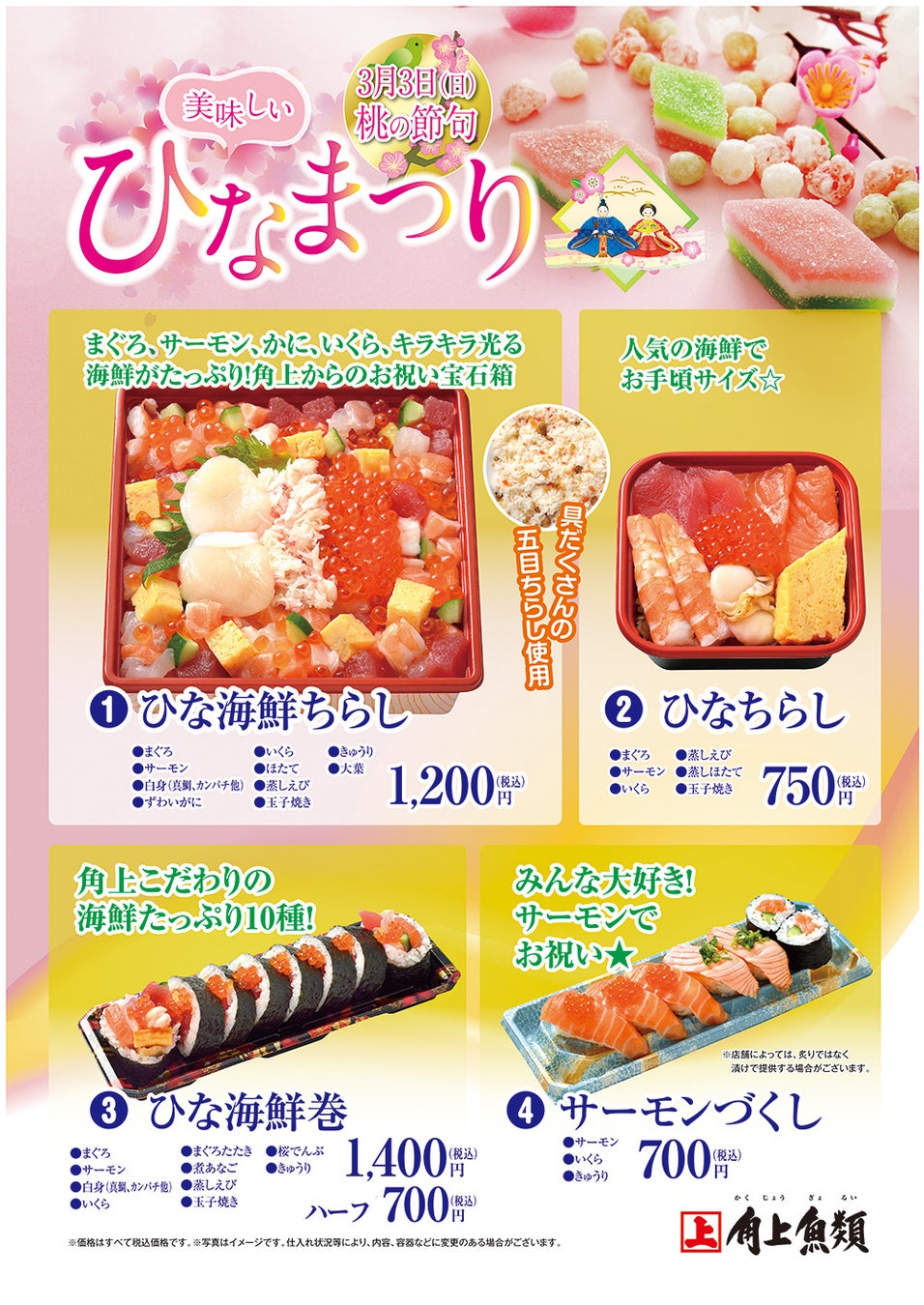3月3日(日) 桃の節句ひなまつり 角上魚類では海鮮たっぷりのちらし寿司など、お祝いメニューを各種ご用意しています。
