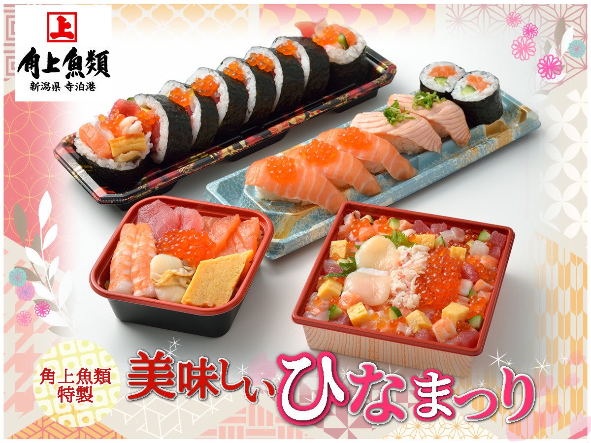 鮮魚チェーンストア「角上魚類」 (角上魚類ホールディングス株式会社 本社:新潟県長岡市)では、たっぷりの海鮮具材がきらめくちらし寿司や、お子様にも人気の高いサーモンづくしの寿司セットなどひな祭りメニュー各種をご用意しております。
