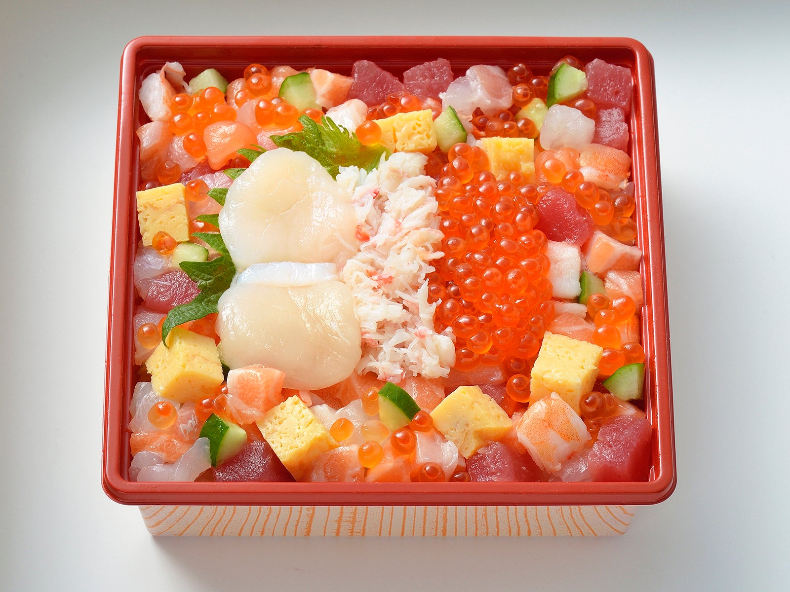 まぐろ、サーモン、白身、いくら、蒸しえび など海鮮きらめくお祝い宝石箱です。