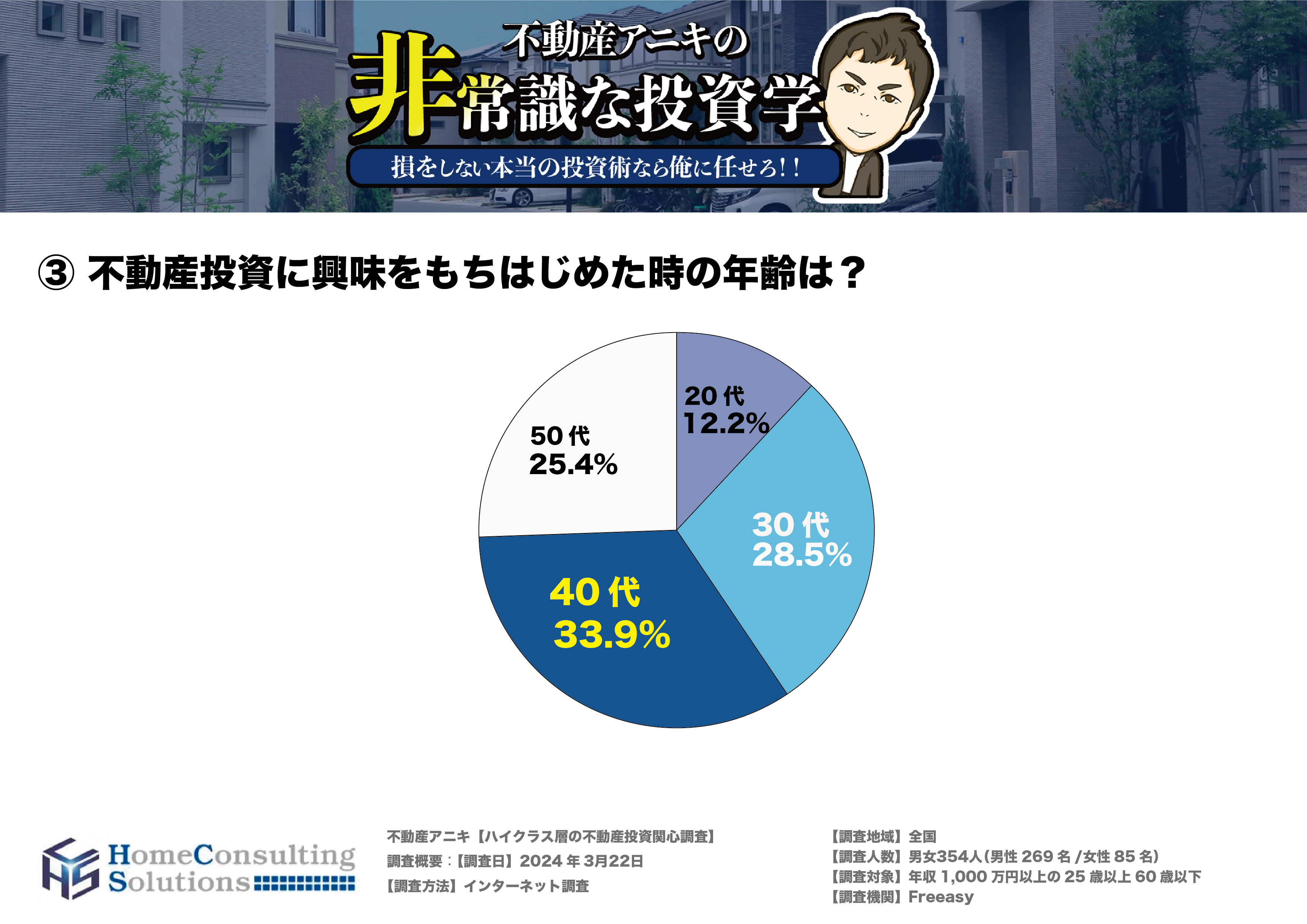 『不動産投資に興味をもちはじめたときの年齢は?』と伺うと、「40代」約4割(33.9%)、と回答しました。以下「30代」約3割(28.5%)、「50代」約3割(25.4%)、「20代」約1割(12.3%)です。