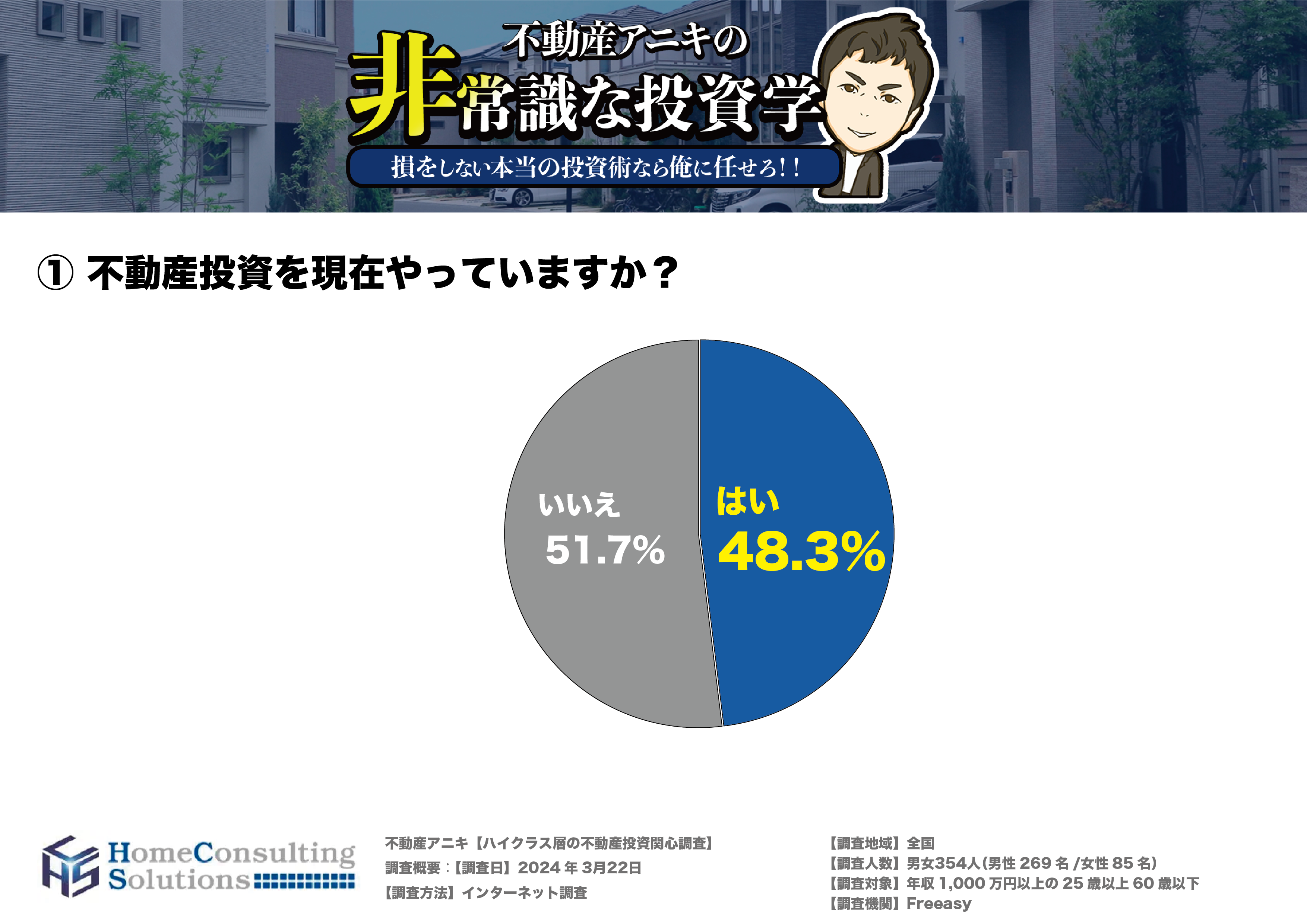 まず不動産投資に興味がある年収1000万円以上・全国男女25〜60歳の354名に、不動産投資を現在やっていますか?と伺ったところ、171名(48.3%)は、不動産投資をやっていると回答しました。