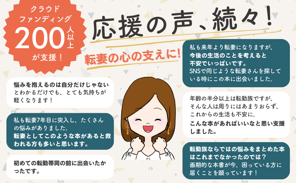 この本には、そんなこれまでの想いや経験をすべて詰め込みました。転勤族の妻は大変かもしれないけど、不幸ではない。転勤族である今の自分の人生を楽しめるようになれたら、もう怖いものはありません。この本を読んだ一人でも多くの転勤族の妻の方が、転勤による孤独や不安を乗り越えて今よりさらに充実したHappyな毎日を過ごすことができたら嬉しいです。