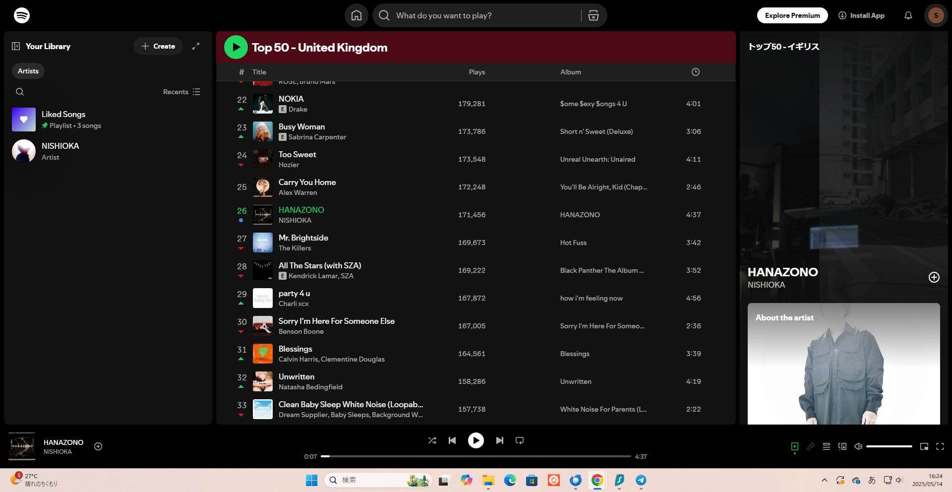 シンガーソングライターNISHIOKAの最新楽曲『HANAZONO』が、2025年5月14日にSpotify UKのTOP50チャートで26位にランクイン。5月3日にはiTunes UKのシンガーソングライター部門でも5位を記録