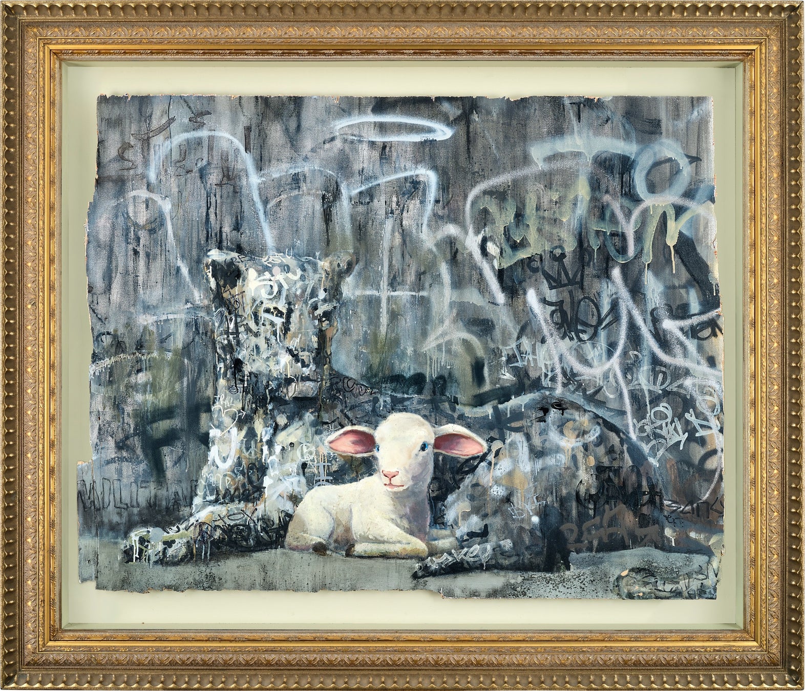イブニングセールに出品されるバンクシーの《The Leopard and Lamb》(2016)は、ベツレヘムの分離壁の近くにある有名なウォールド・オフ・ホテルで展示されていた作品で、調和の瞬間を捉えています。この作品は、ヒョウが羊の隣で平和に横たわる姿を描き、イザヤ書11:6の「狼は小羊と共に宿り豹は子山羊と共に伏す」との預言的なイメージを呼び起こします。この視覚的なメタファーは、天敵が穏やかに共存するという聖書の引用を豊かにするだけでなく、戦争や紛争をさりげなく批判し、平和という普遍的な希望への省察を促します。