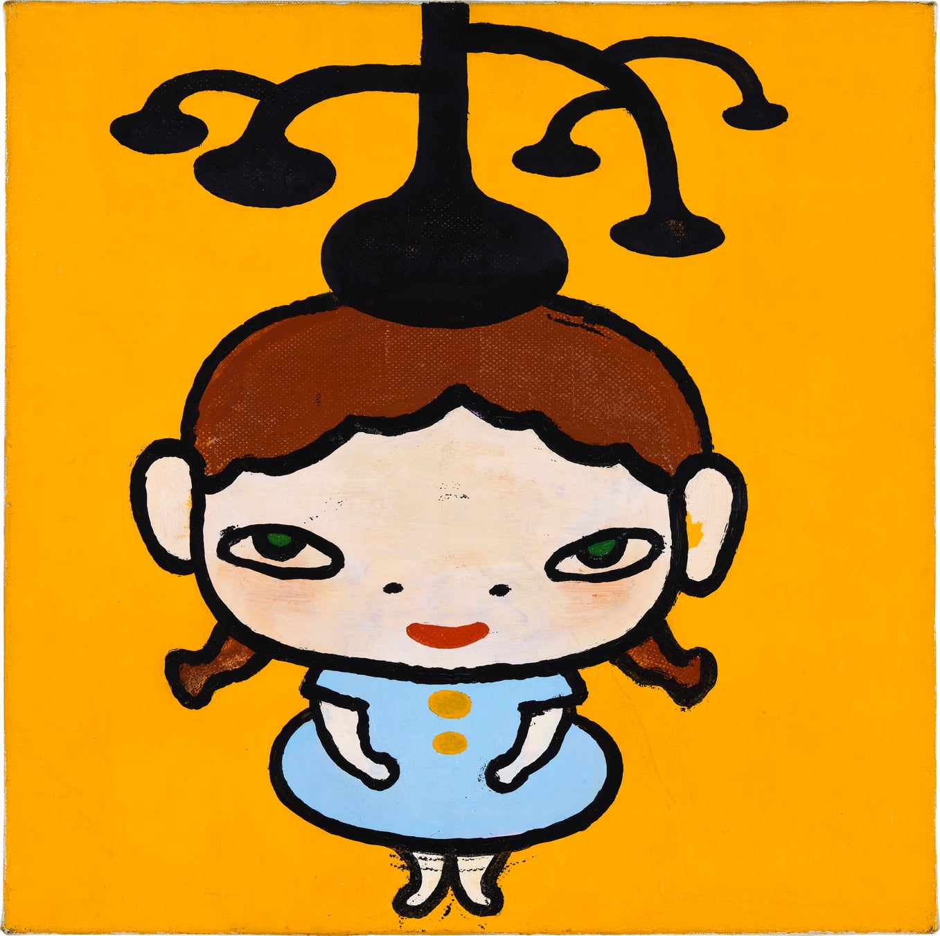 奈良美智の《O.T (N.G)》は、ベビーブルーの不思議の国のアリス風のドレスを着た奈良美智の象徴的な少女が描かれており、アーティストの過去オークショントップ10のうち3つの作品に共通しています。全身像、アーモンド形の下向きの目、何層にも塗り重ねられた色彩の背景など、この絵画は奈良が描く少女の特徴を最もよく表しています。