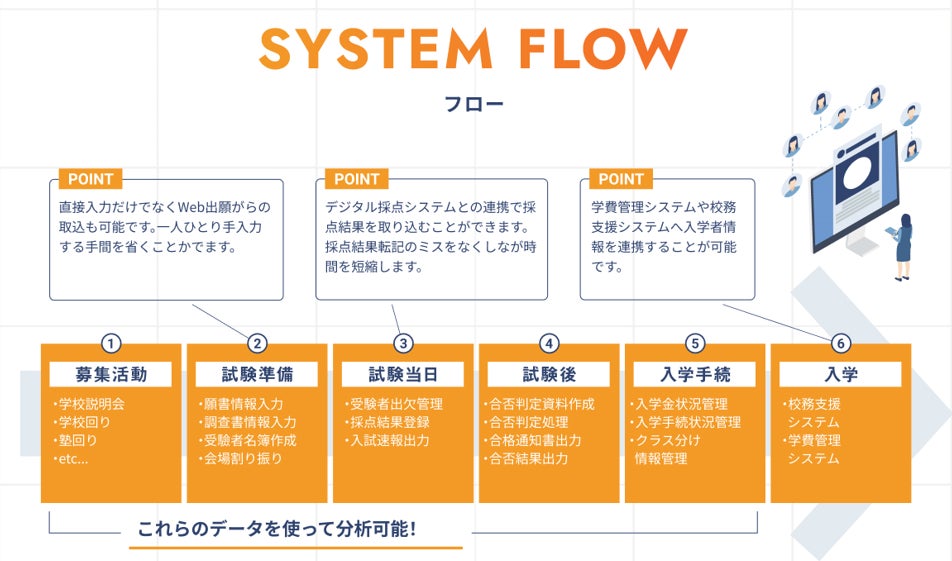 ⑧ 他システムへの連携:WEB出願やデジタル採点等の他社システムとの連携ができます。運用中のシステムを使っていただきながらシームレスな連携をサポートします。