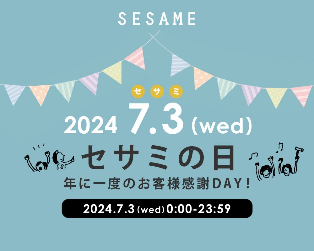 10年間の感謝を込めて、2024年7月3日(水)の「セサミの日」当日に『SESAME家具インテリア楽天市場店』でお買い物をしていただいた方、先着100名様にSESAMEオリジナルグッズをプレゼント。さらに、Instagramのフォロワーの方限定でお得なキャンペーンも開催いたします。