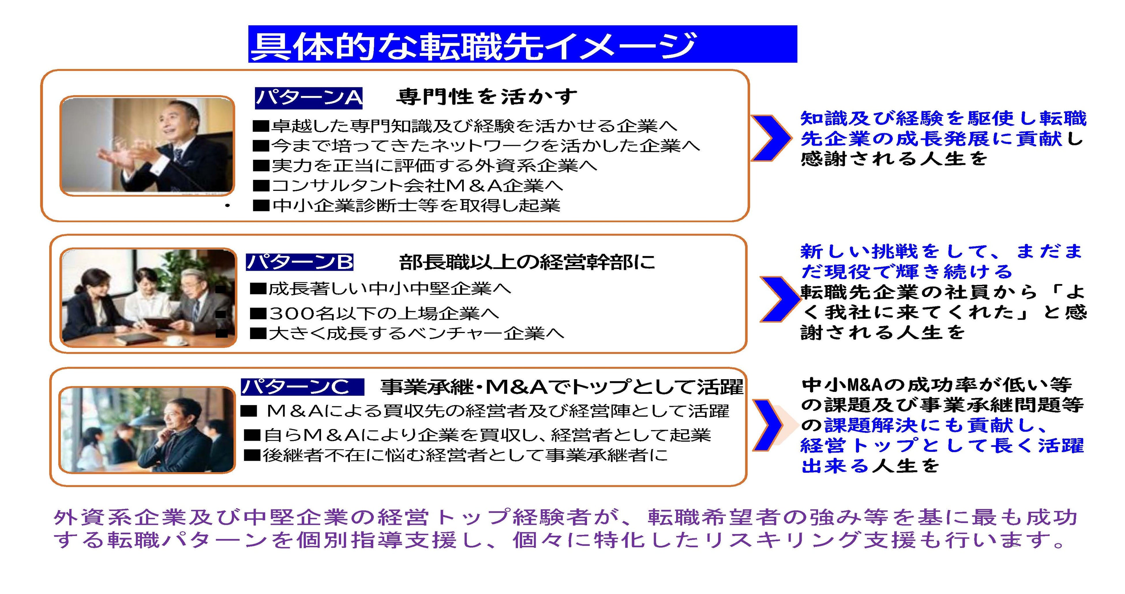 これまでの課長職から一つ二つ上の成長分野の企業で部長以上の経営幹部・幹部社員として活躍するサポートを強化しています。これにより、「大企業からよく我社に来てくれた」と感謝される第2の人生を歩む転職をサポートしています。