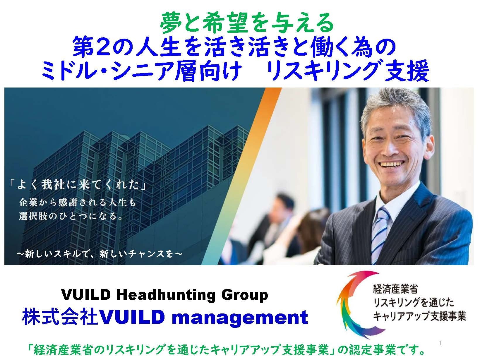 令和5年9月15日当社「成長分野の中小中堅企業へのヘッドハンティング事業」が経済産業省の「リスキリングを通じたキャリアアップ支援事業」に認定される。 https://vuild-headhunting.com/