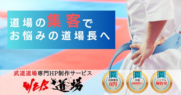 道場を新たに開設した道場長を支援するために開設から1年以内の道場限定で、HP代金の初月分を無料とさせていただきます。(最大14,980円)