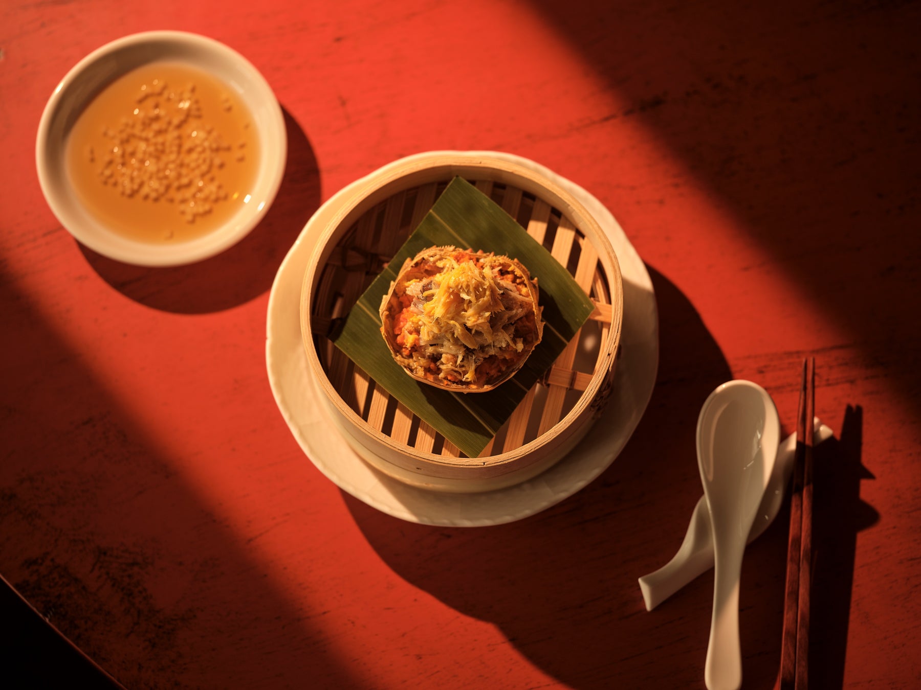 「特選上海蟹の姿蒸し*」は、上海蟹の産地として有名な江蘇省産の特選上海蟹を、姿のまま強火で蒸しあげ、素材の鮮味を閉じ込めます。お客さまが食べやすいよう、シェフたちによって丁寧に掻き出された蟹肉と蟹みそは、甲羅に盛り付けられます。虎景軒の特製生姜酢とご一緒にお召しあがりください。