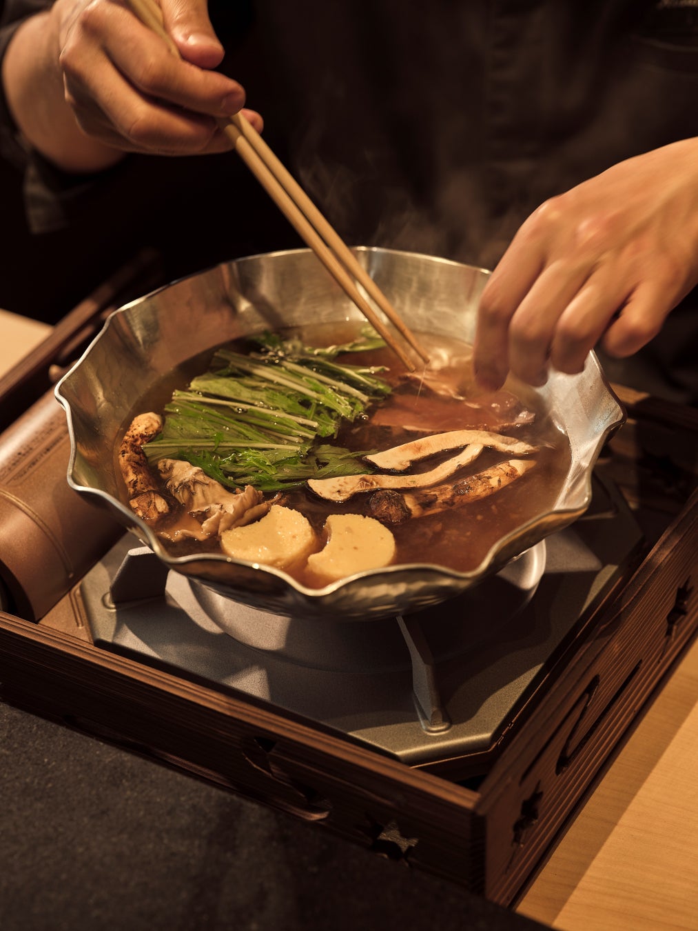 「合鴨炭炙りと茸煮物碗」は、炭火で焼き上げた柔らかな合鴨と香り高い旬の松茸を、秋の月夜に見立てた煮物碗に仕上げました。