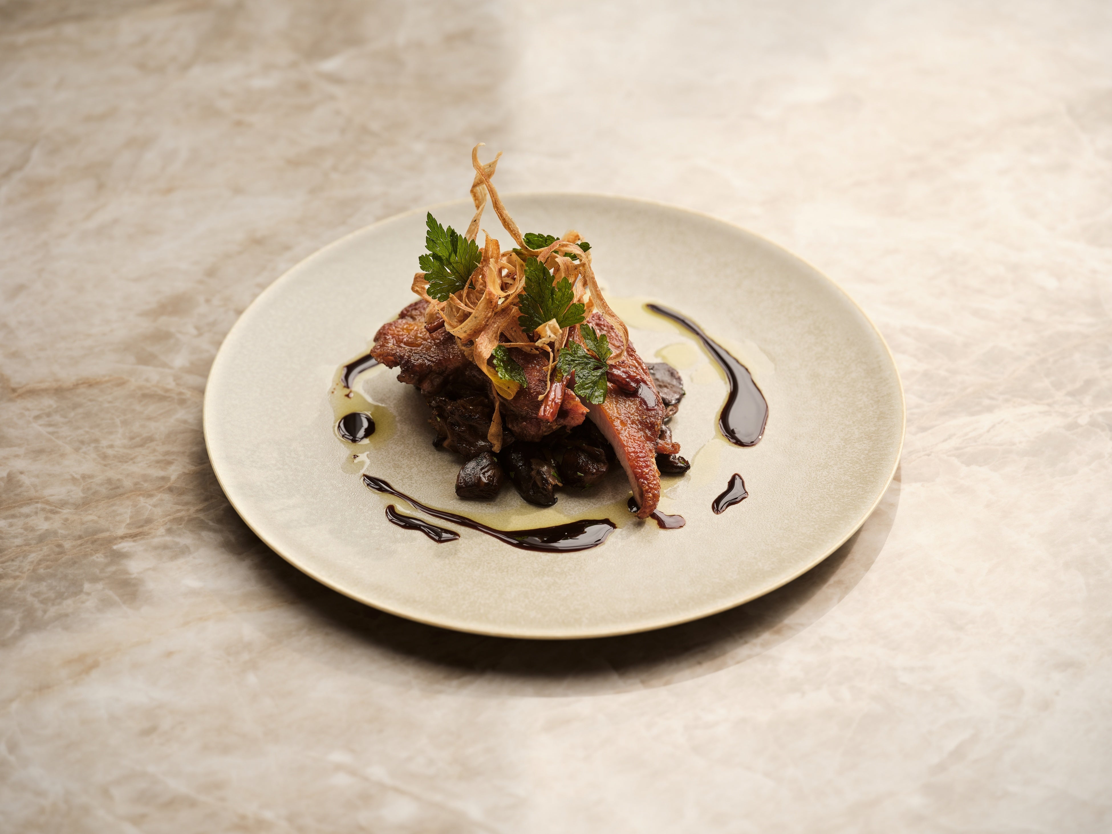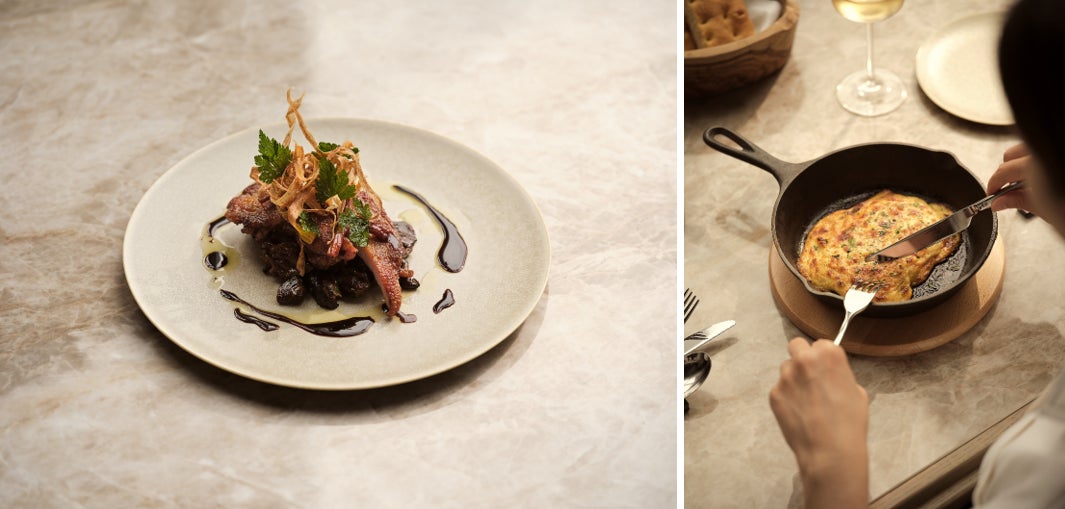天井までの高い窓から、自然光が降り注ぐオールデイイタリアンダイニング「ジャヌ メルカート」では、「東京の秋市場」をテーマに、旬の食材をふんだんに使ったメニューを、秋季限定でご提供いたします。「東京しゃものロースト 茸のソテー バルサミコビネガー」は、自然豊かな生育環境にこだわった、東京が誇るブランド鶏の東京しゃもをシンプルにロースト、5年熟成のバルサミコビネガーを効かせ、マッシュルームやアワビダケ、大黒しめじなどの旬の茸と、貴重な東京しゃものレバー、ハツ、砂肝も余すことなく使ったソテーと合わせました。12年熟成のバルサミコビネガーの濃厚なソースは、甘味と酸味が絶妙なバランスを織り成します。オリーブオイルでカリッとした食感に仕上げたごぼうのチップスとともにお召し上がりください。