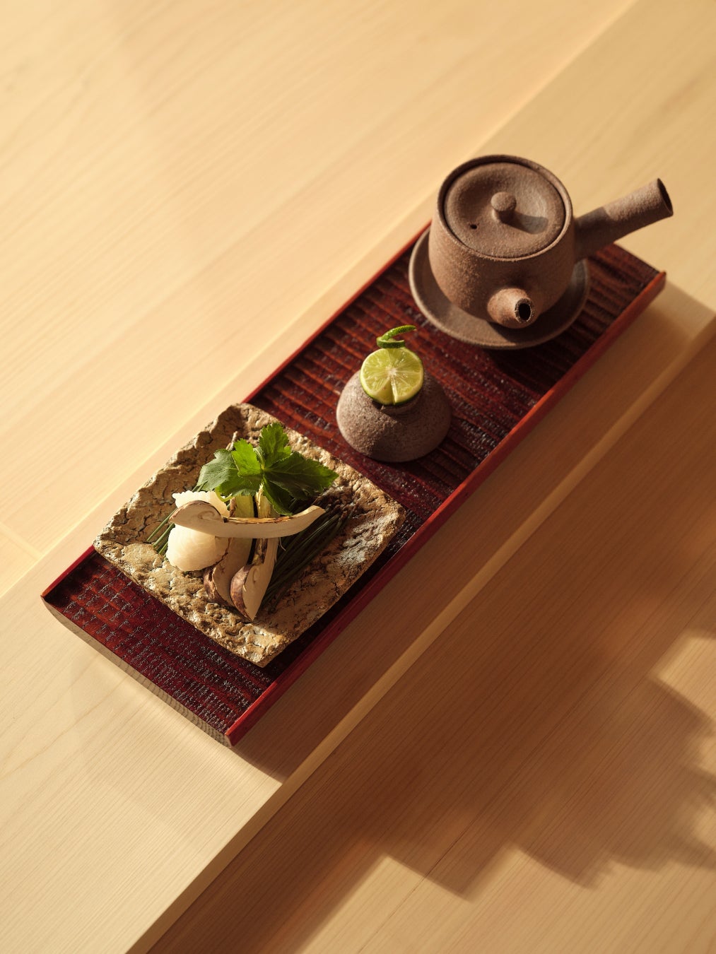 長年の歴史を持つ江戸前鮨の伝統を再解釈した「飯倉 (いいぐら)」では、9月10日 (火) から11月9日 (土) までの秋季限定で、飯倉のテーブル席でのみご提供する「ランチ御膳」と、アラカルトまたはおまかせコース「縁 (えにし)」の一品アップグレードとして、国産松茸を使った「松茸の土瓶蒸し」が登場いたします。