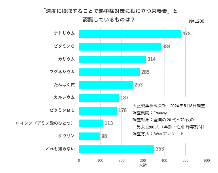 熱中症対策の栄養管理に関して正しい知識を持つ人はまだまだ少なく、大正製薬株式会社が2024年5月に実施した調査によると、熱中症対策として摂取したい栄養素(たんぱく質、ナトリウム、カリウム、マグネシウム、タウリン、ロイシン(アミノ酸のひとつ)、ビタミンB1、カルシウム、ビタミンC)のうち、それらの栄養素が熱中症対策になると知っているかを聞いたところ、1200人中の353人、3割弱の29.4%の人が「どれも知らない」と回答。すべて認知していた人はわずか27人(2.3%)でした。また、認知している人が多い栄養素順ではグラフのような結果になっています。