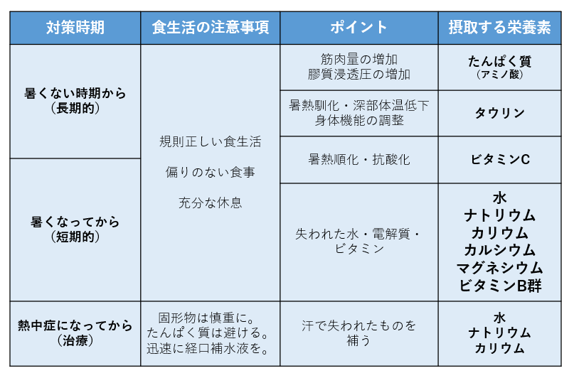 熱中症になりづらい身体づくりは、まだ暑くない今の時期から開始しましょう。一年を通して継続するべき長期的な対策としては、「貯水しやすい身体」と「暑熱順化(しょねつじゅんか=暑熱環境への順応)」を意識した栄養素の摂取が重要になります。