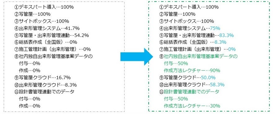 当初からデキスパート、写管屋の導入率は100%でしたが、導入後の活用や浸透まではうまくいっておりませんでした。そこで当社による支援を実施した半年後の浸透率を見てみると、特に出来形管理システムの導入比率が50%以下だったのが75%、写管屋・出来形管理連動の導入比率が54%だったのが83%と、目に見える効果が得られました。