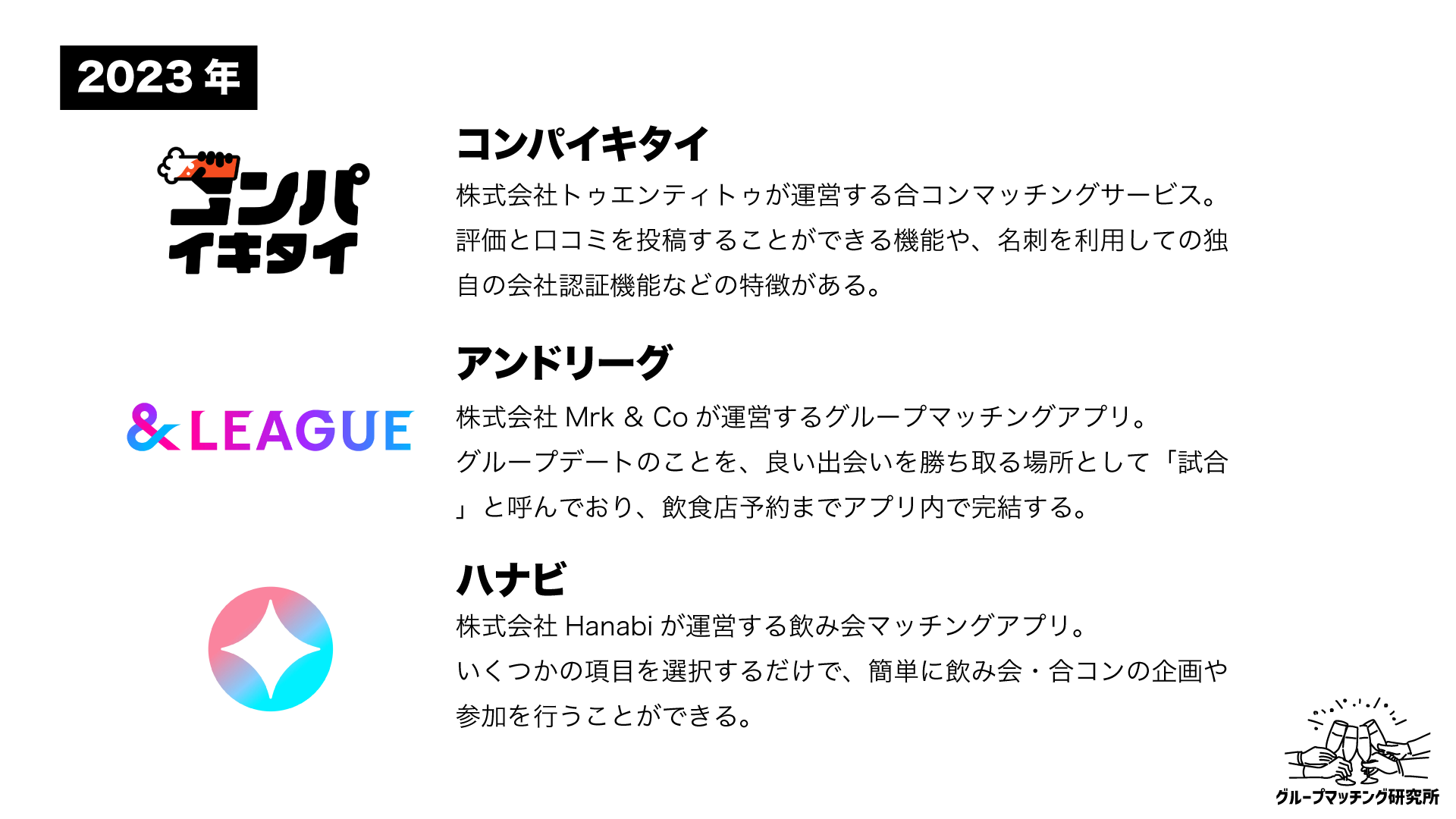 そして、コロナ禍の行動制限がなくなり、日常生活が戻ってきた2023年には「コンパイキタイ」「&LEAGUE(アンドリーグ)」「Hanabi(ハナビ)」という3つの合コンマッチングサービスが同時期にリリースされました。