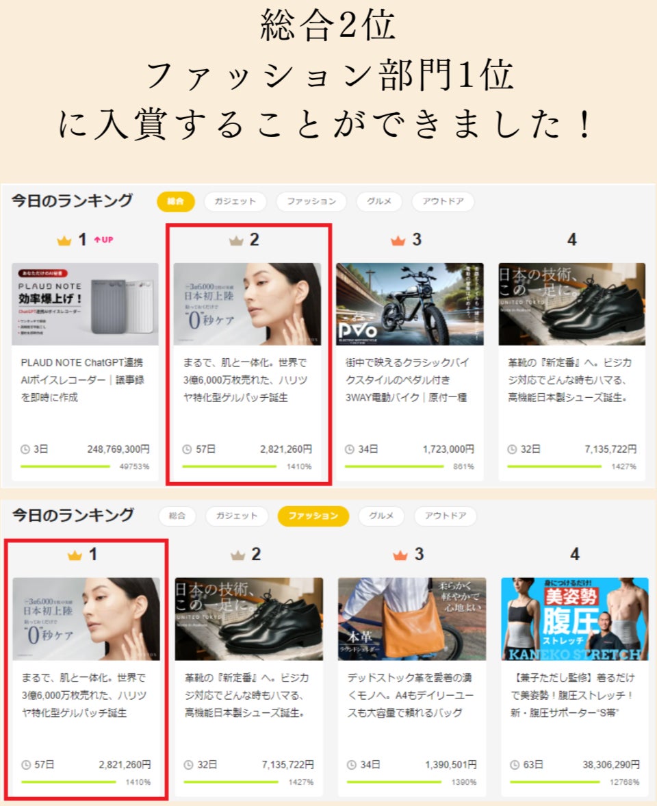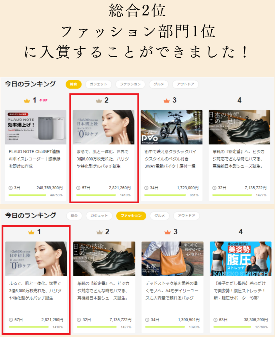たくさんの方々にご支援いただき、公開開始からわずか1分で目標金額を達成し、Makuake公開初日で目標達成率1059%を突破。【総合部門2位】【ファッション部門1位】を獲得するなど好調なスタートを切りました。