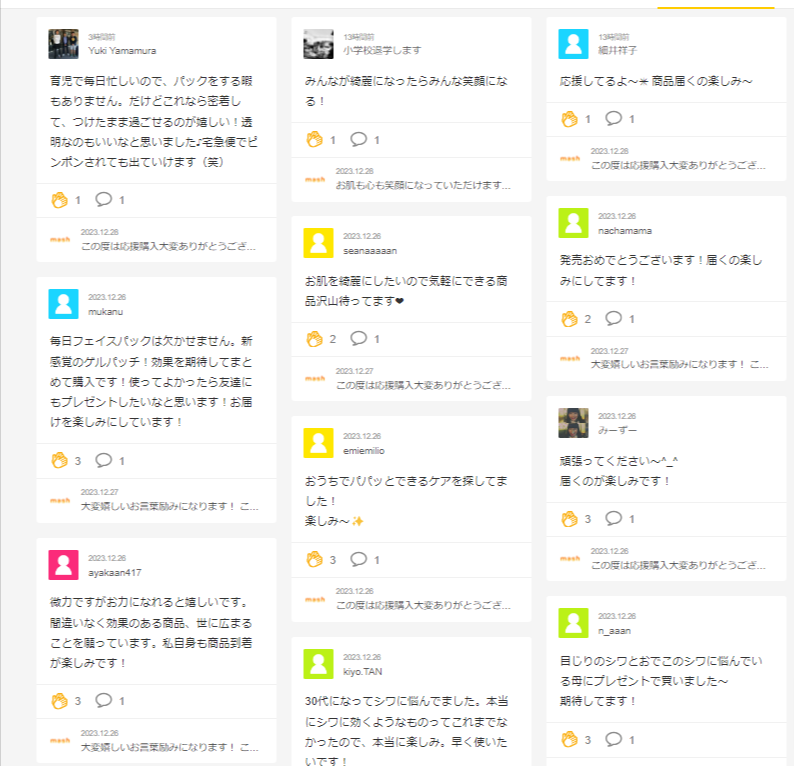 「水に100%溶けるっていうのがいい。シートマスクはゴミになるし、水にとけて使い切れるという観点は新しい。コスメに普段手は出しませんが、これは面白いとおもい購入しました。」
