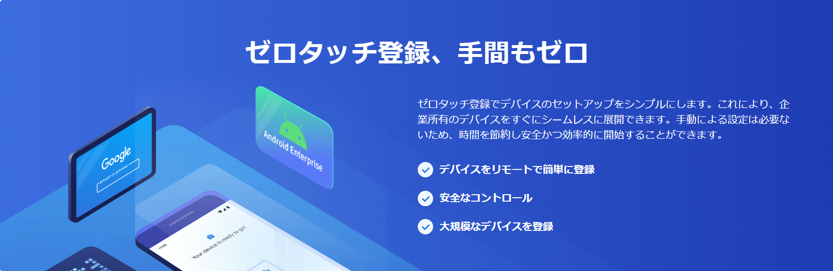 企業のIT管理者は、手動のデバイスセットアップや構成なしで数百台、数千台のAndroidデバイスを簡単に構成および展開できます。