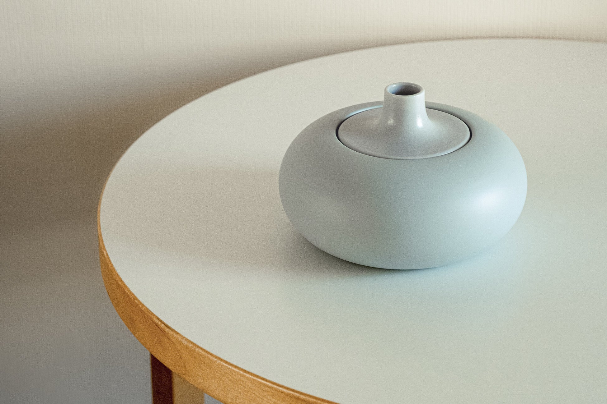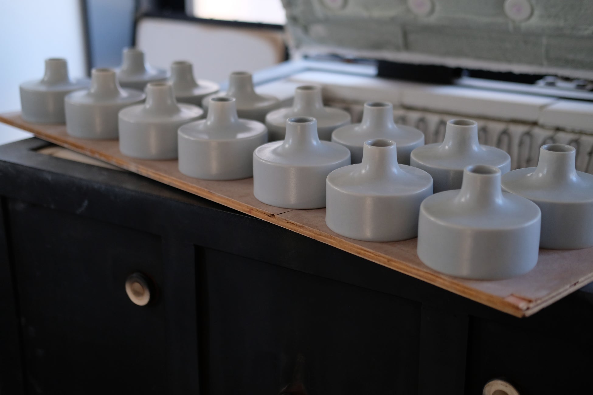 花瓶部分は、磁器の原料となる、磁土から制作されています。白さときめ細かさが特徴で、硬く焼き上げることで締まるため、水漏れの心配もありません。仕上げに、オリジナルで調合した釉薬をかけ、1,230度の窯で焼成しました。