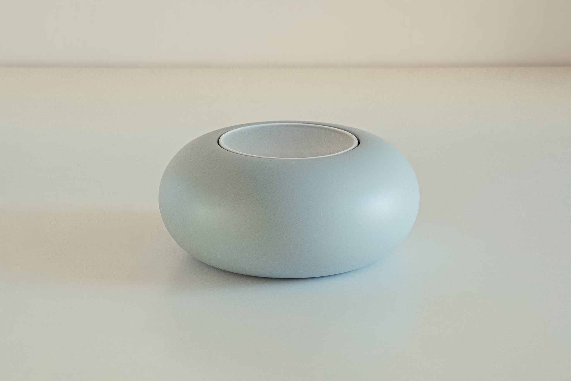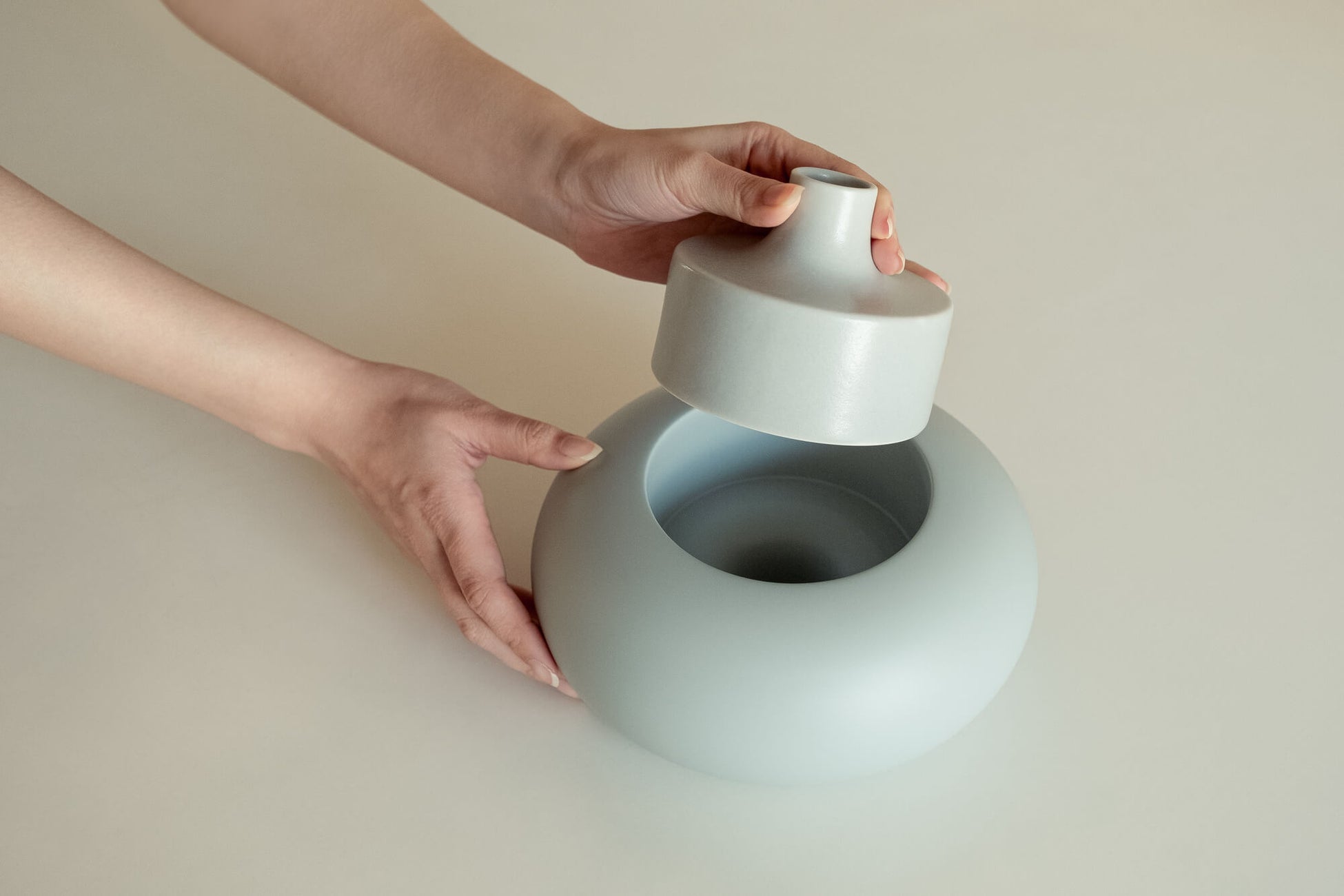 この花瓶の特徴は、猫が遊んでも倒れないように、重心を下にした丸みを帯びた形状で作成したこと、そして土台部分と花瓶部分に部品が分かれていることです。この設計とすることで、お花部分を猫がいくらつんつんしたとしても、花瓶が倒れない設計になっています。土台部分は約1.3kgの重さがありますが、水を入れるのは花瓶部分のみなので、毎日の水替えや洗い物が簡単にできます。