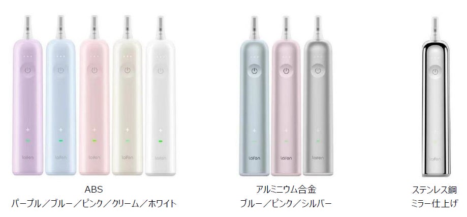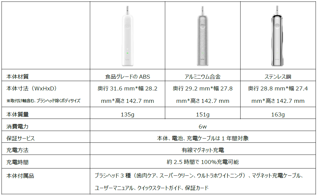 ※3…本体のほか、ブラシヘッド3種(歯肉ケア、スーパークリーン、ウルトラホワイトニング)、マグネット充電ケーブル、ユーザーマニュアル、クイックスタートガイド、保証カードが付属。ブラシヘッドはABS本体にはホワイトタイプ、アルミニウム合金本体とステンレス鋼本体には透明色タイプが付属します。
