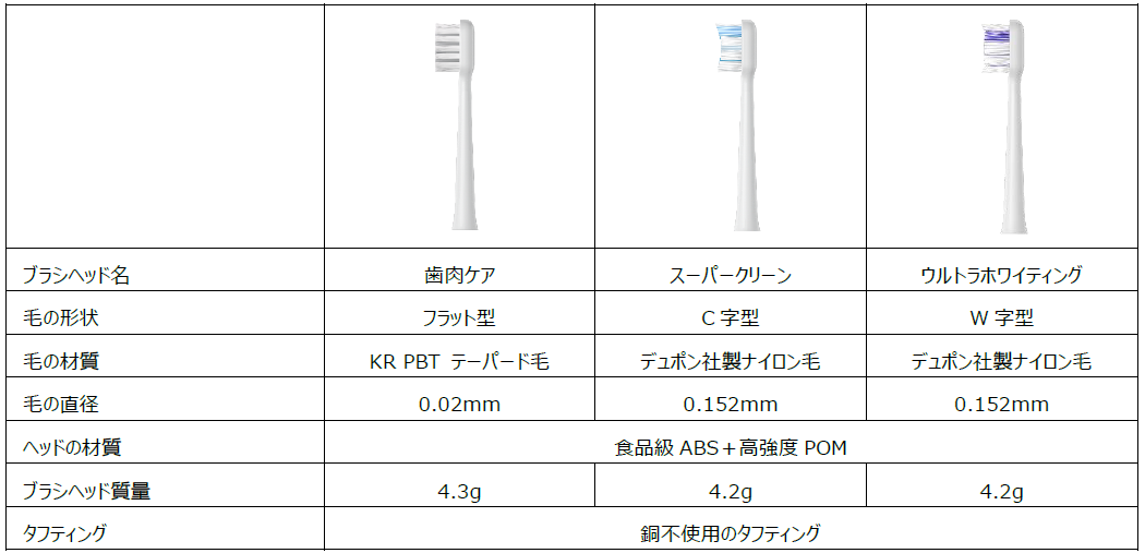 ブラシヘッドの設計には業界最先端の銅不使用のタフティング技術を採用し、安全面への考慮と細菌の増殖を効果的に抑制するほか、W字型およびC字型のブラシヘッドには、世界最大手の化学メーカーであるデュポン社が手掛けるナイロン毛を採用し、ダイヤモンド断面で高い洗浄効果を実現します。