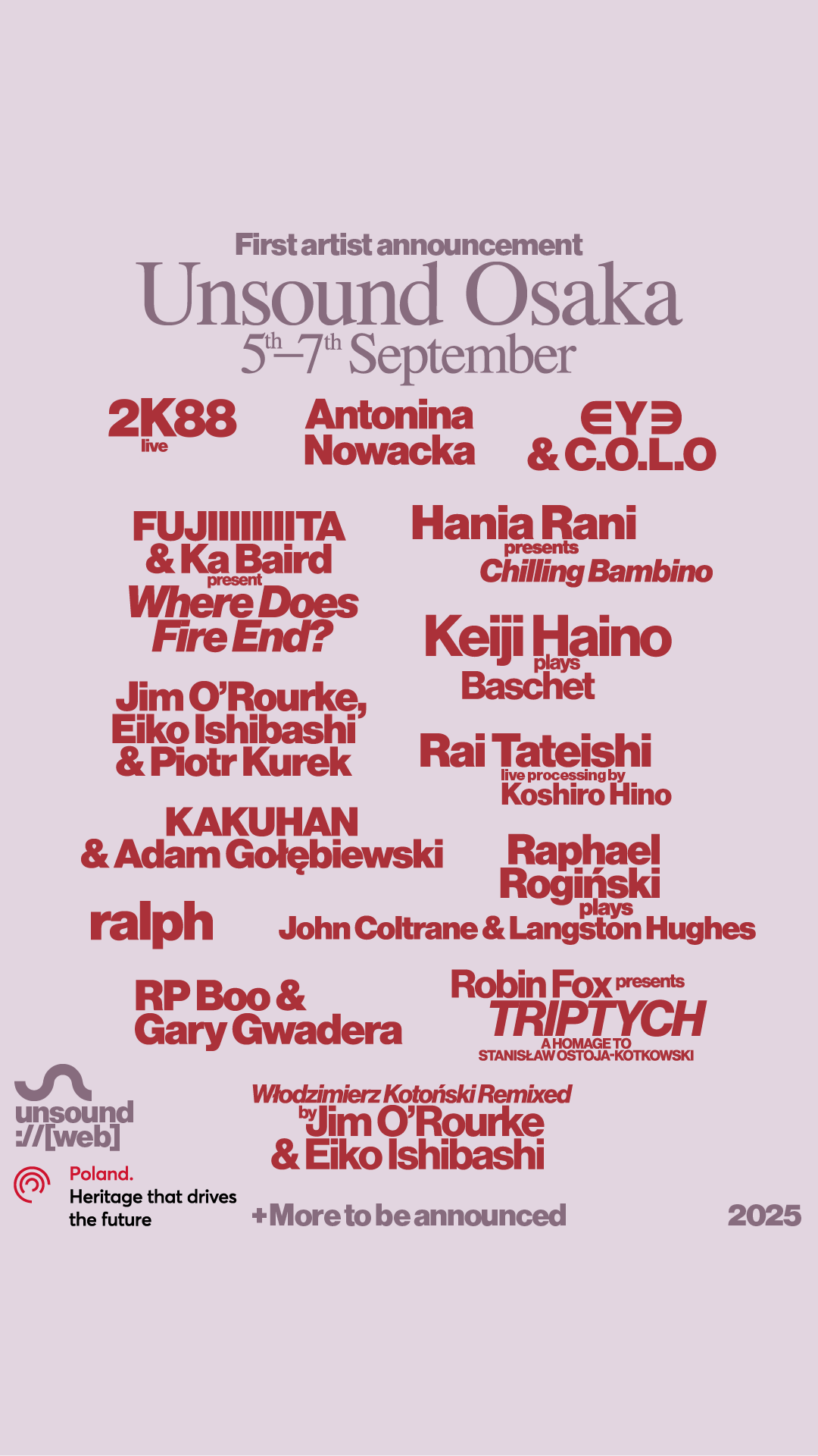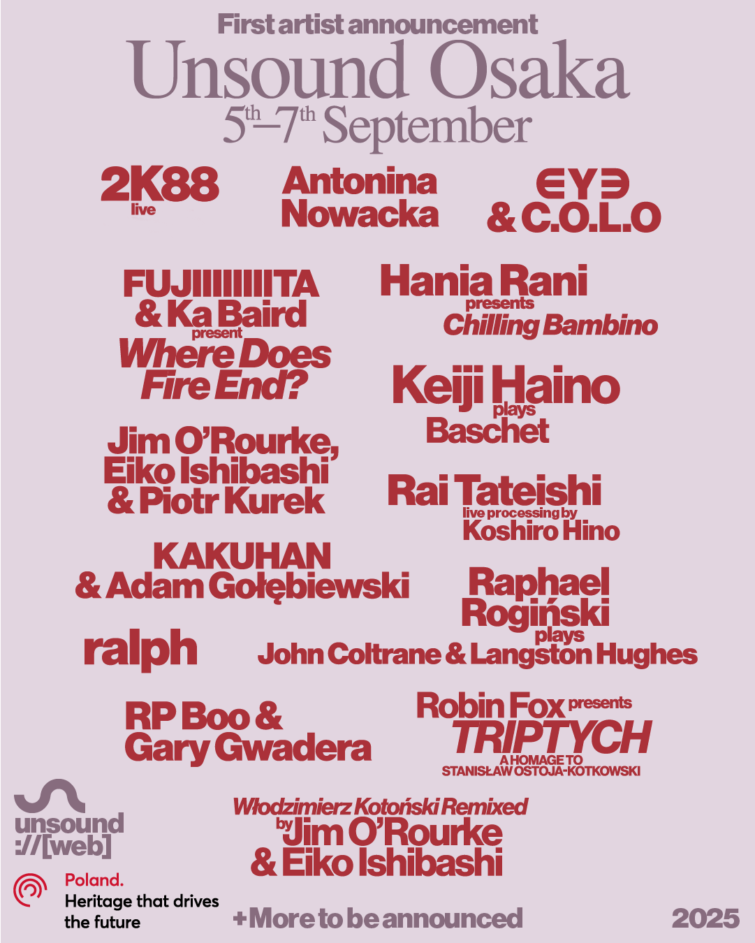 日本初開催となるUnsound Festivalのプログラムが、2025年9月5日から7日にかけて、大阪市内の複数会場で開催されます。今回のプログラムは、今秋開催が予定されているニューヨークやクラクフでのメインフェスティバルと並ぶ一連のシリーズとして展開されます。大阪版では、ポーランドと日本のアーティストに焦点を当て、伝説的な存在から国際的に注目を集める新進気鋭のアーティストが出演。初共演となるステージや特別プロジェクトの発表も多数予定されています。