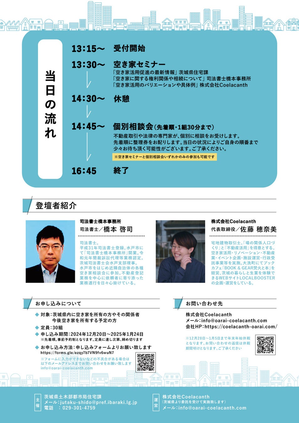 茨城県と、茨城県を中心に「地域から価値をつくる」ことを掲げ活動する、株式会社Coelacanth(シーラカンス)(本社:茨城県 東茨城郡⼤洗町、代表:佐藤 穂奈美 以下「当社」)は、空き家対策の一環として、空き家オーナー向けに「空き家セミナー&個別相談会を開催いたします。