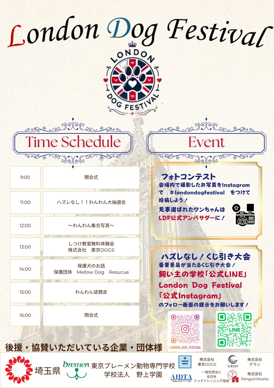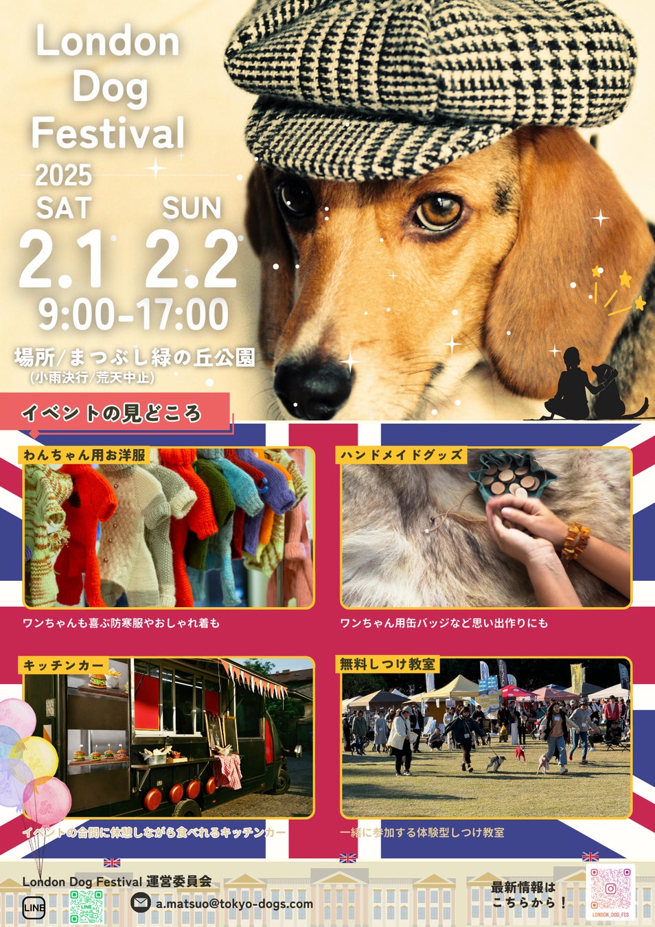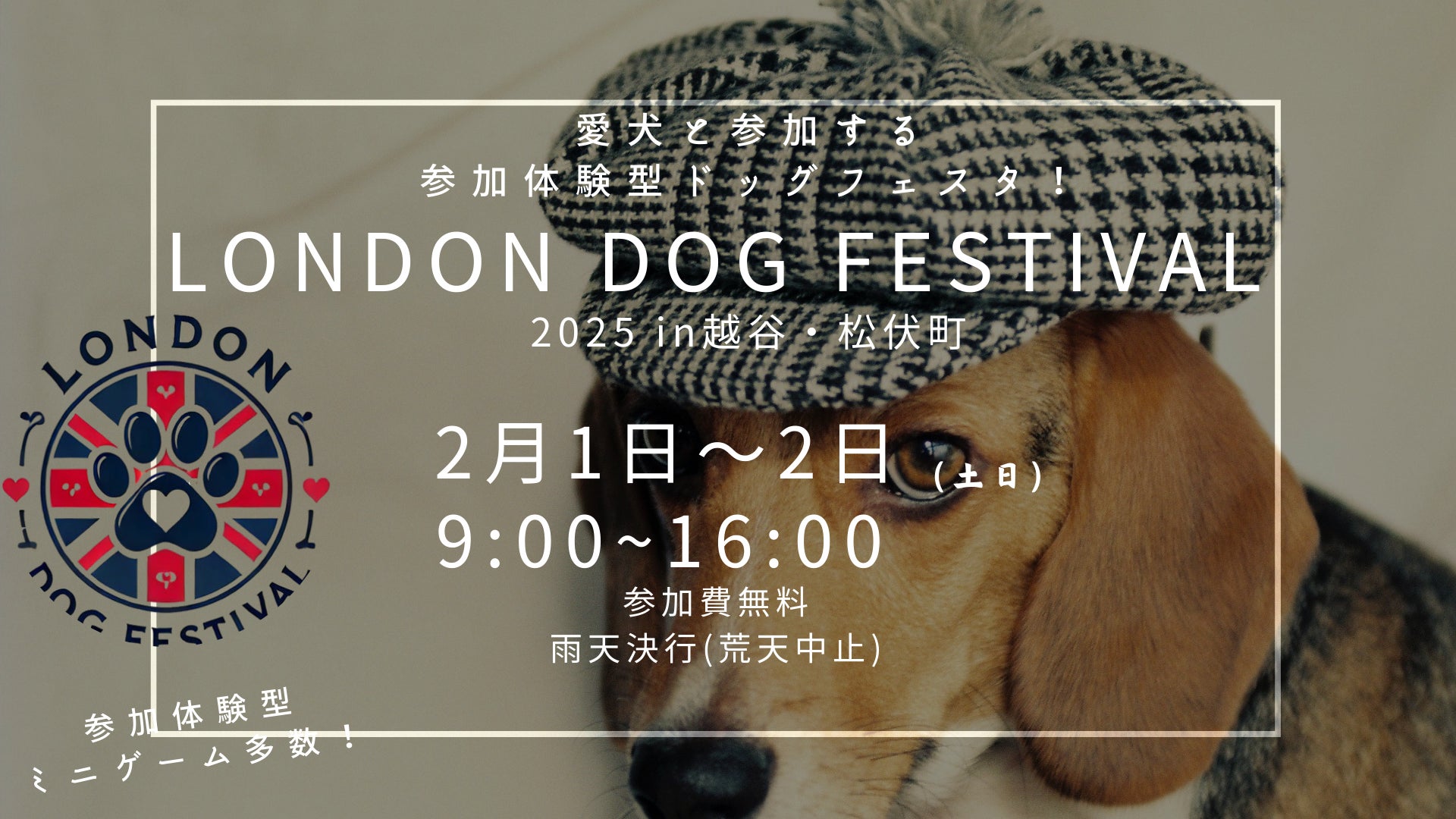 株式会社東京DOGS(本社:埼玉県越谷市川柳町1丁目298、代表取締役:松尾邑仁)は、埼玉県および学校法人野上学園(東京ブレーメン動物専門学校)の後援のもと、2025年2月1日(土)・2日(日)に「まつぶし緑の丘公園」(埼玉県北葛飾郡松伏町2606-1)で、ペット先進国である英国のロンドンをテーマにした大規模ドッグイベント「London Dog Festival(ロンドンドッグフェスタ)2025」を開催いたします。
