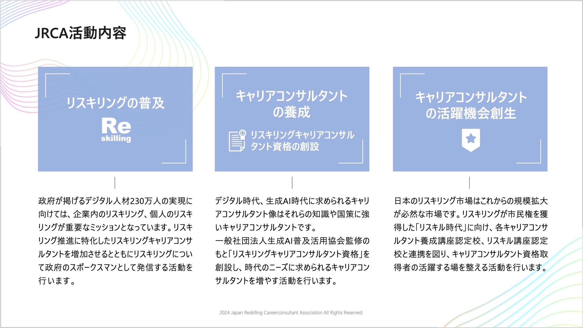 JRCAは「リスキリングの普及」「キャリアコンサルタントの養成」「キャリアコンサルタントの活躍機会創生」の3つを軸とした活動を行います。生成AI時代のリスキリング推進に特化したキャリアコンサルタントの増加に向け、政府のスポークスマンとしてリスキリングに関する発信を通じた啓発活動を行ったり、一般社団法人生成AI活用普及協会(GUGA)監修のもと「リスキリングキャリアコンサルタント資格」を創設したり、といった取り組みを推進します。さらには、厚生労働大臣が認定する「キャリアコンサルタント養成講座認定校」や経済産業大臣が認定する「第四次産業革命スキル習得講座(Re スキル講座)認定校」と連携を図り、キャリアコンサルタント資格取得者が活躍できる場を整える活動を行うことで、キャリアコンサルタント一人ひとりがより輝ける未来の構築を目指します。