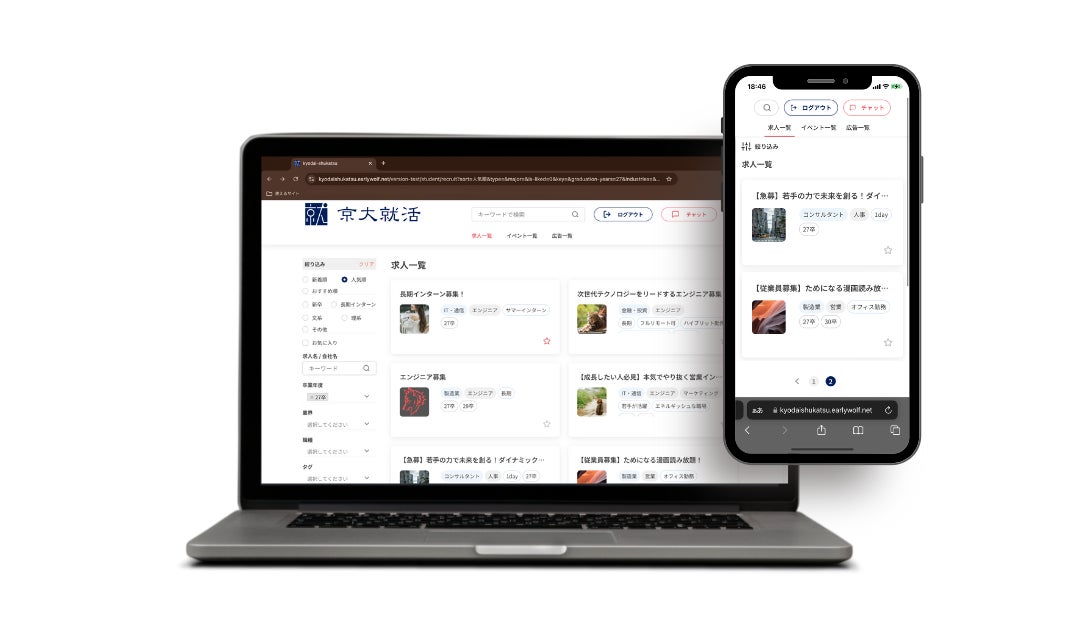 京大生専用の就活サイト「京大就活」は、長期インターンの募集新卒求人の掲載をはじめ一連の機能を備えています。イベント集客や広告表示に加え、ダイレクトリクルーティング機能も搭載しており、企業と学生が効率的にさらに短期間でのコミュニケーションを可能にするチャット機能も実装し、迅速でスムーズな手続きが可能です。 多彩な機能を活用して、就職活動をより便利に効果的にサポートするサイトを実現しました。