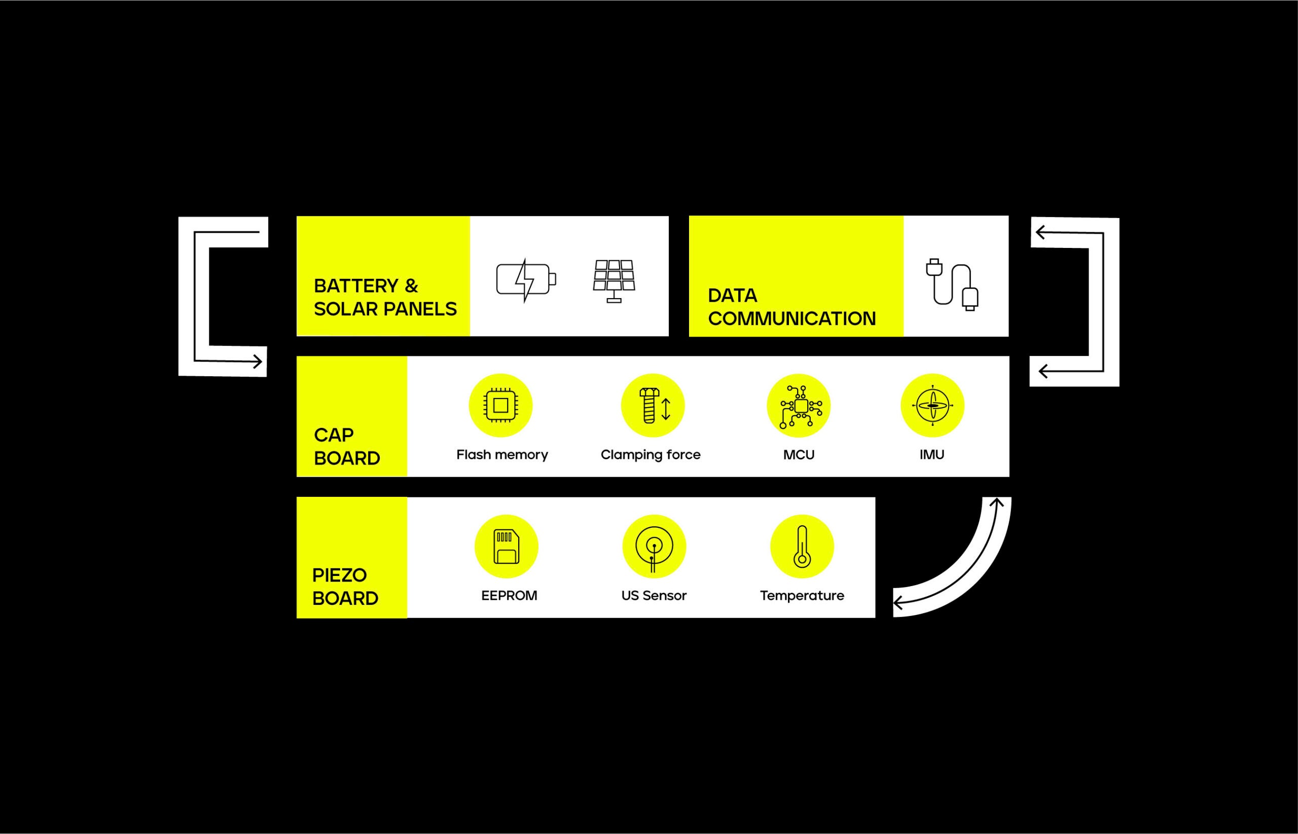 ハードウェア:センサーネットワークをボルト接続部に取付け、ゲートウェイに接続し、システムをセットアップします。専用プラットフォームからインフラストラクチャをリアルタイムで監視します。