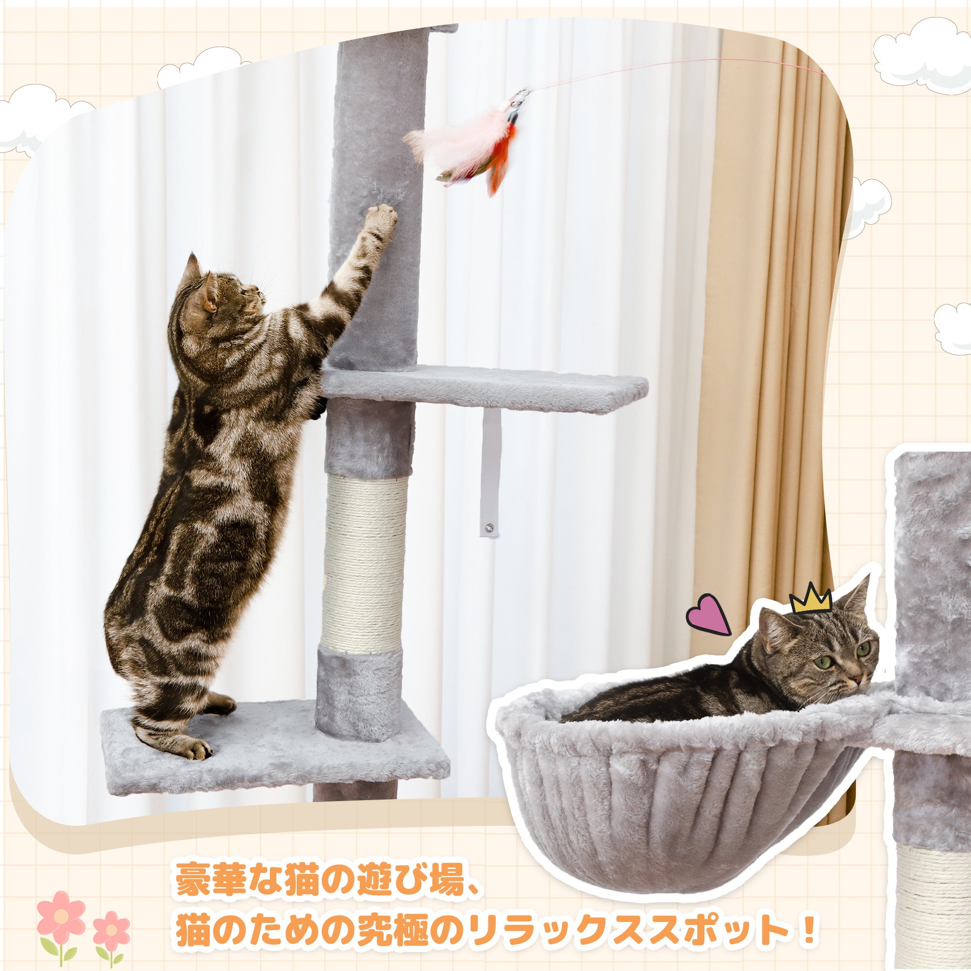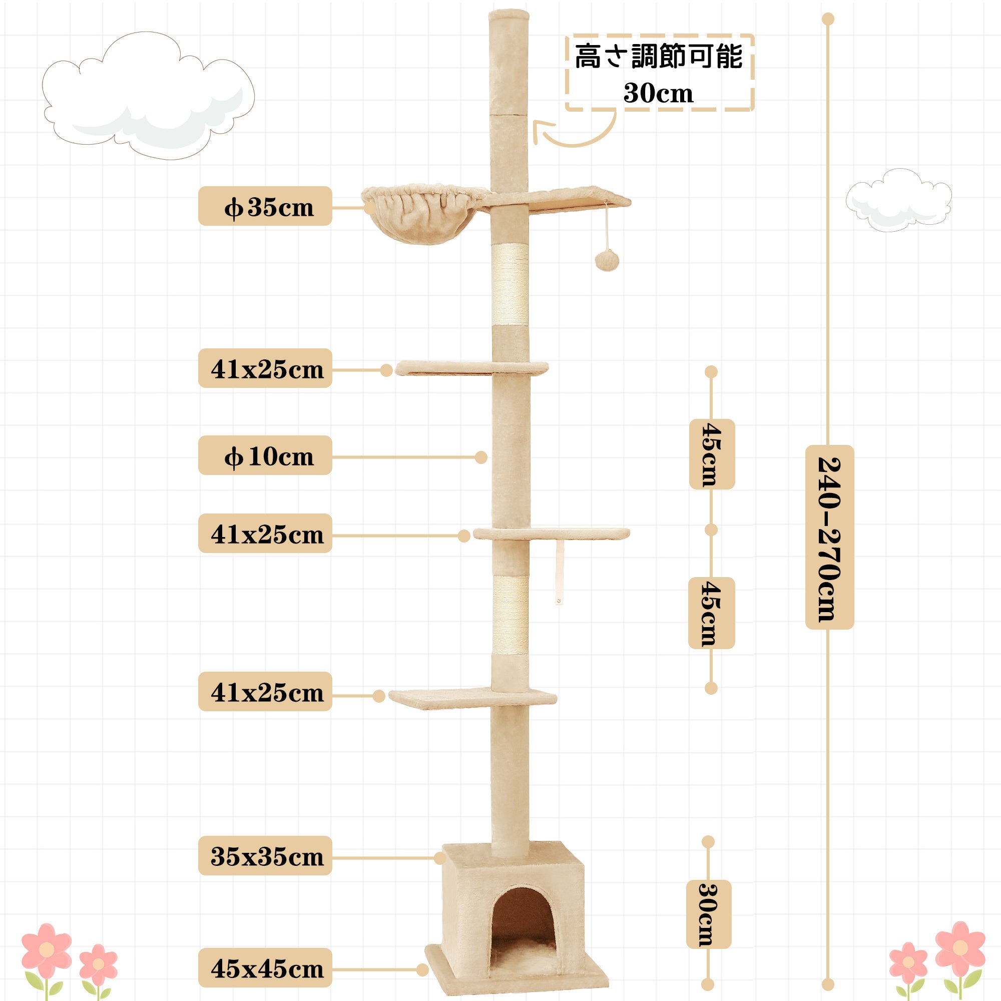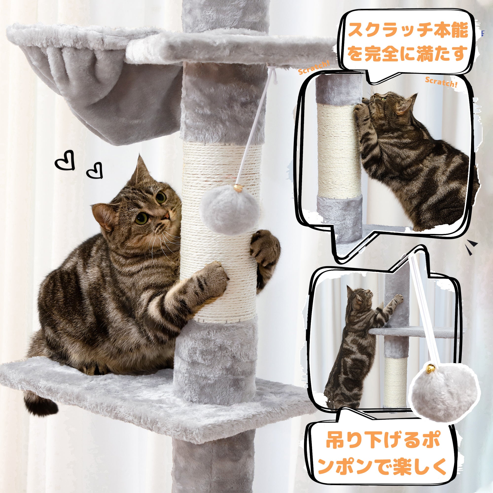 5.趣味: 伝統的な一柱式キャットツリーとは異なり、私たちのデザインは猫の楽しみを重視しています。ユニークな構造には猫ベッド、ブランコ、高台などが含まれ、猫の遊び心と探求心を引き出します。