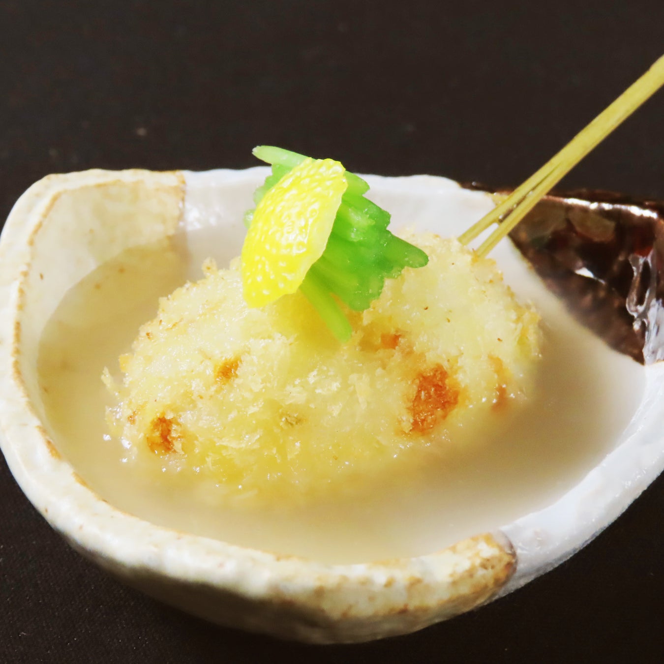 三重県産の極上生ハマグリをたっぷりの日本酒で酒蒸しにし魚のすり身と合わせて香り高い真丈に仕立てました。