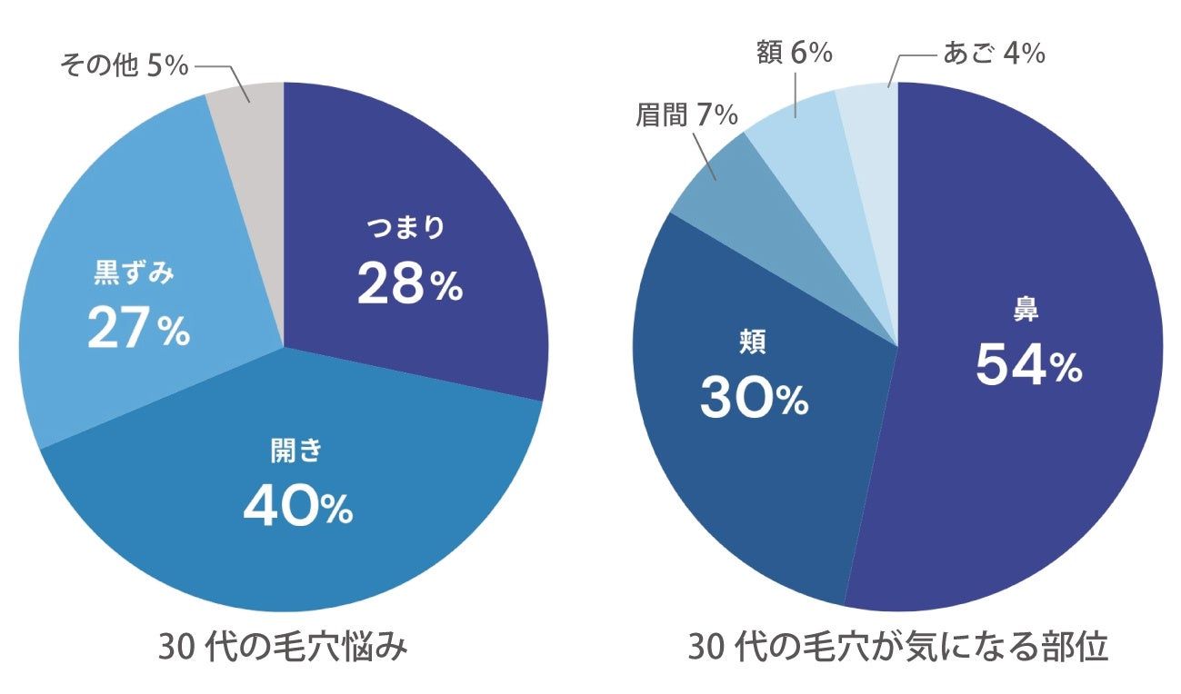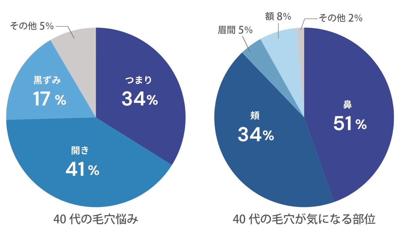 30代では、20代で悩まされていた「毛穴のつまり」よりも「毛穴の開き」が主要な悩みとして挙げられています。毛穴が気になる部位として、頬の割合が増えている点を踏まえると、皮脂分泌が落ち着く一方で、紫外線ダメージの蓄積やエイジングによる肌のハリや弾力が低下することに起因する毛穴の開きが現れ始める年代であることが伺えます。しかし、依然として鼻の毛穴が一番気になることが判明しています。