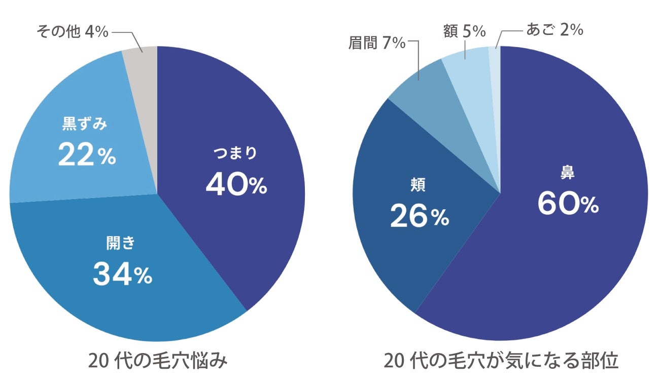 20代は皮脂分泌が活発であるため、毛穴のつまりが最大の悩みとして挙げられます。毛穴が気になる部位としても皮脂分泌が多いとされるTゾーン(鼻・眉間・額)とあごが全体の74%を占めています。これらのことから、20代の毛穴トラブルの2位である開きは、皮脂が過剰に分泌され続けることで常に毛穴が開いた状態になっていることが推測され、20代は皮脂による毛穴トラブルが顕著な年代であることが伺えます。