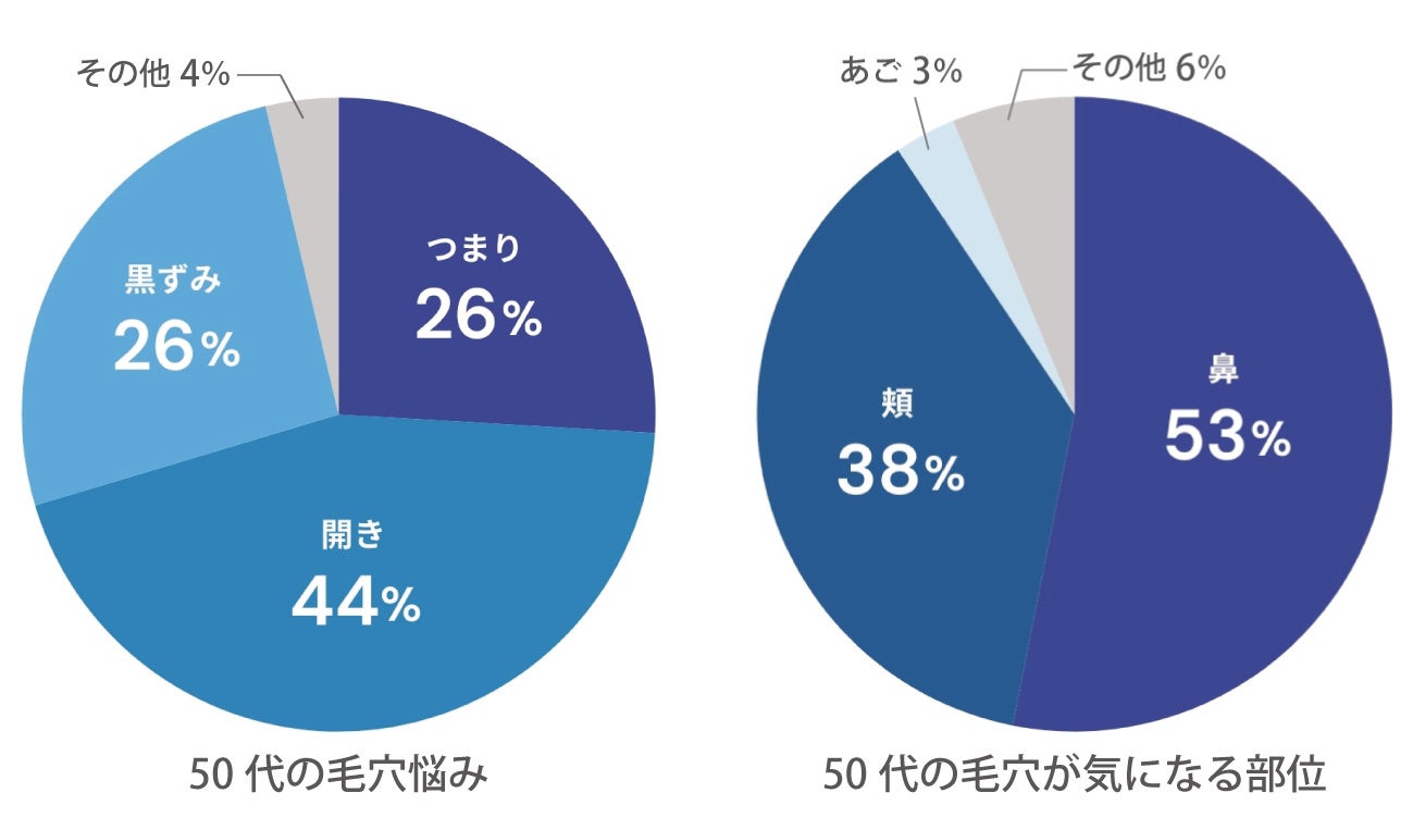 50代では、毛穴の開きが最も多い悩みとして挙げられ、全体の44%を占めています。これは他の悩みに比べて圧倒的に高い割合です。年齢とともに肌のハリや弾力が大幅に低下し、肌のたるみによる毛穴トラブルが顕著に現れることが伺えます。