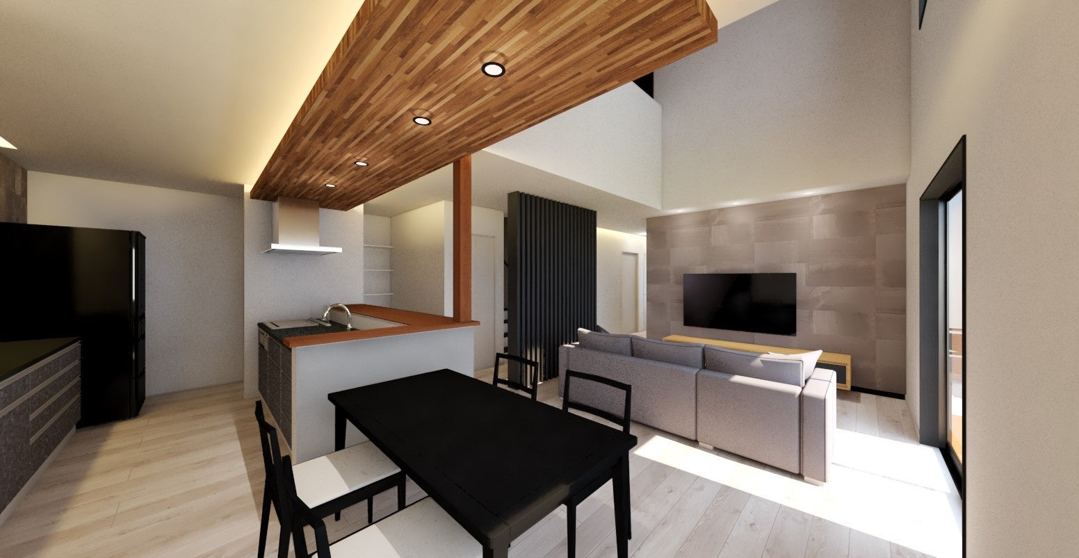 プランの特徴は1階に大きく面積を取った21.8帖の広々リビング・ダイニング・キッチン。広々としたリビングは上部が吹き抜けの空間となっており開放感の高いゆったりと過ごせる空間に。