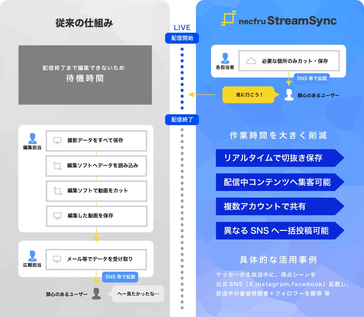 従来の仕組みと、necfru StreamSyncを使用した場合のイメージ