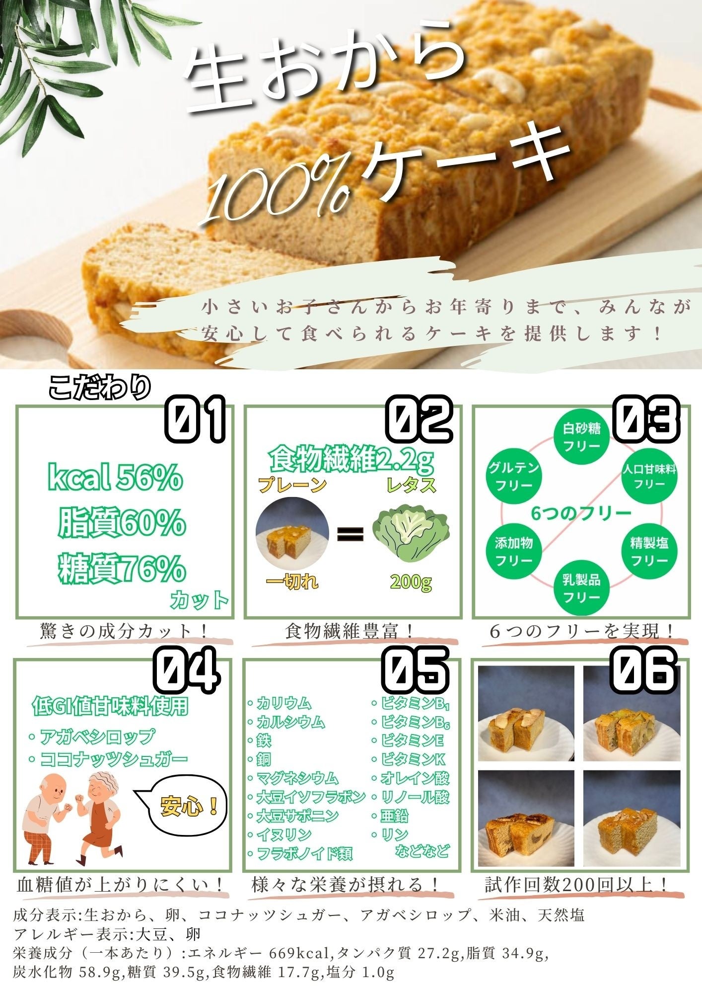 年代問わず、様々な食の悩みをかかけている方でも安心して食べていただける「生おから100%ケーキ」を提供します。