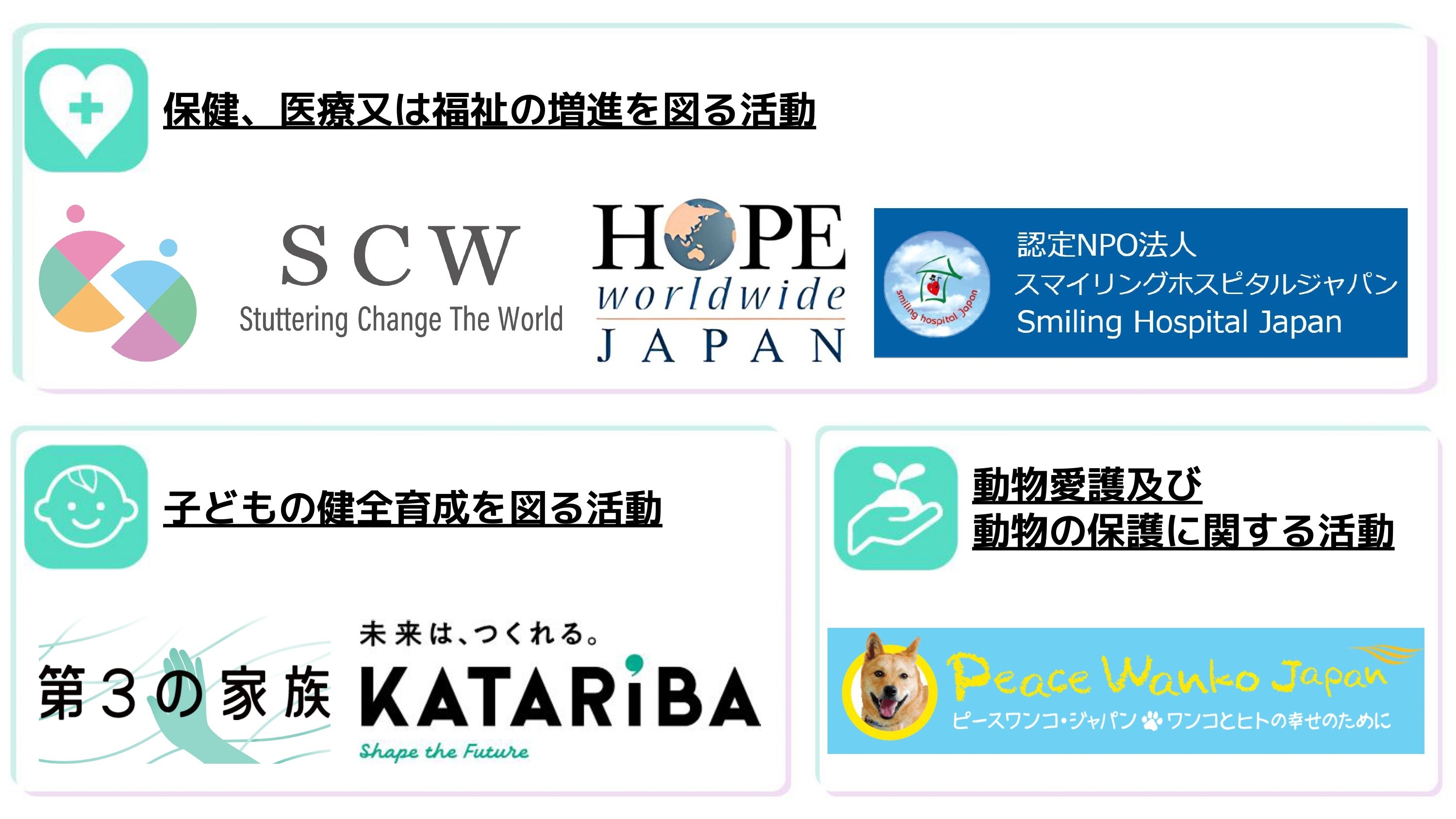 ※寄付先は、特定非営利活動促進法 第二条に制定されたNPO活動分野から選択することが可能です