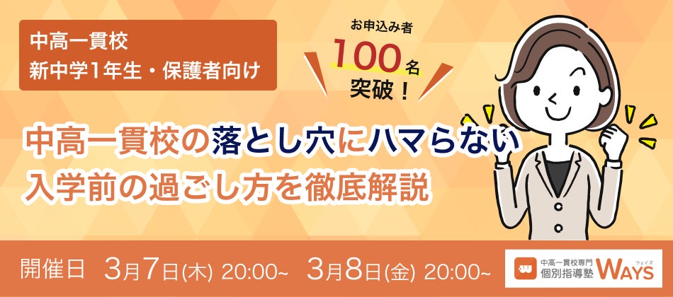 そこで本セミナーでは、これまで500校以上の中高一貫校に通う1万人以上の中高一貫校生を専門に指導してきた『中高一貫校専門 個別指導塾WAYS』が、中高一貫校の授業や定期テストに関する特徴から、入学までにどんな対策しておけば校内の成績を上位で保っていけるのかなどについて徹底的に解説していきます。