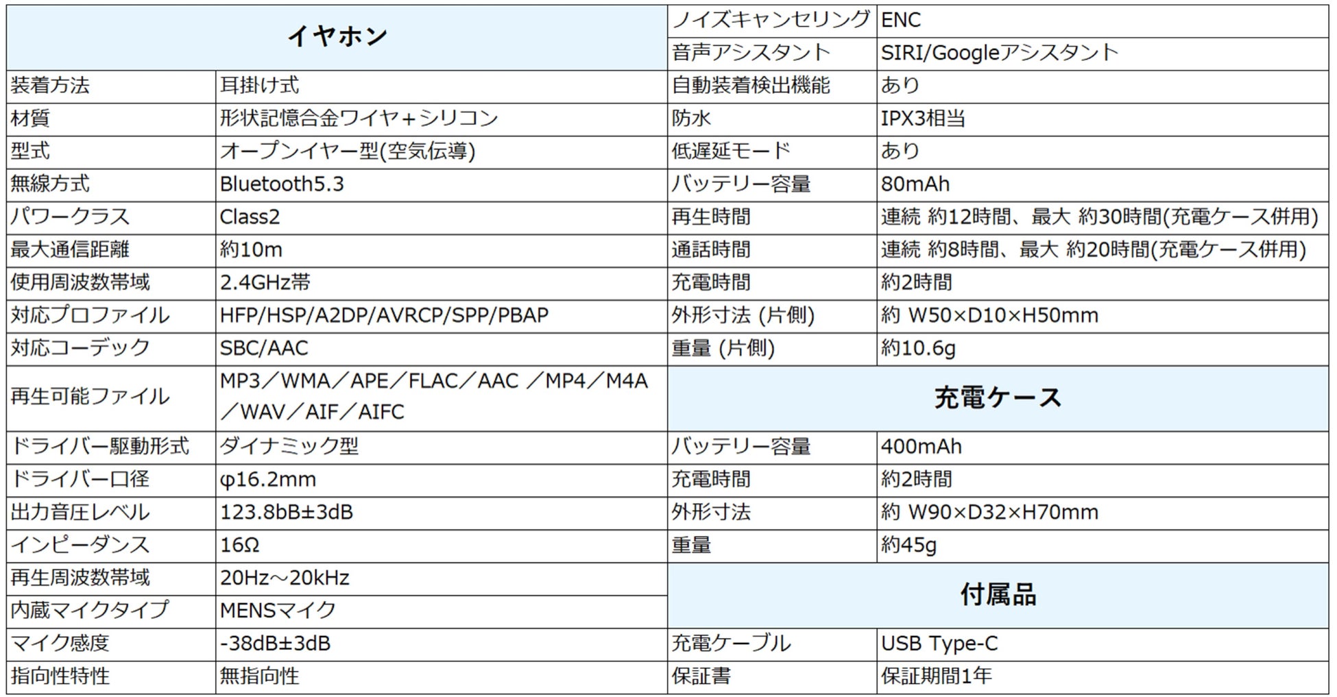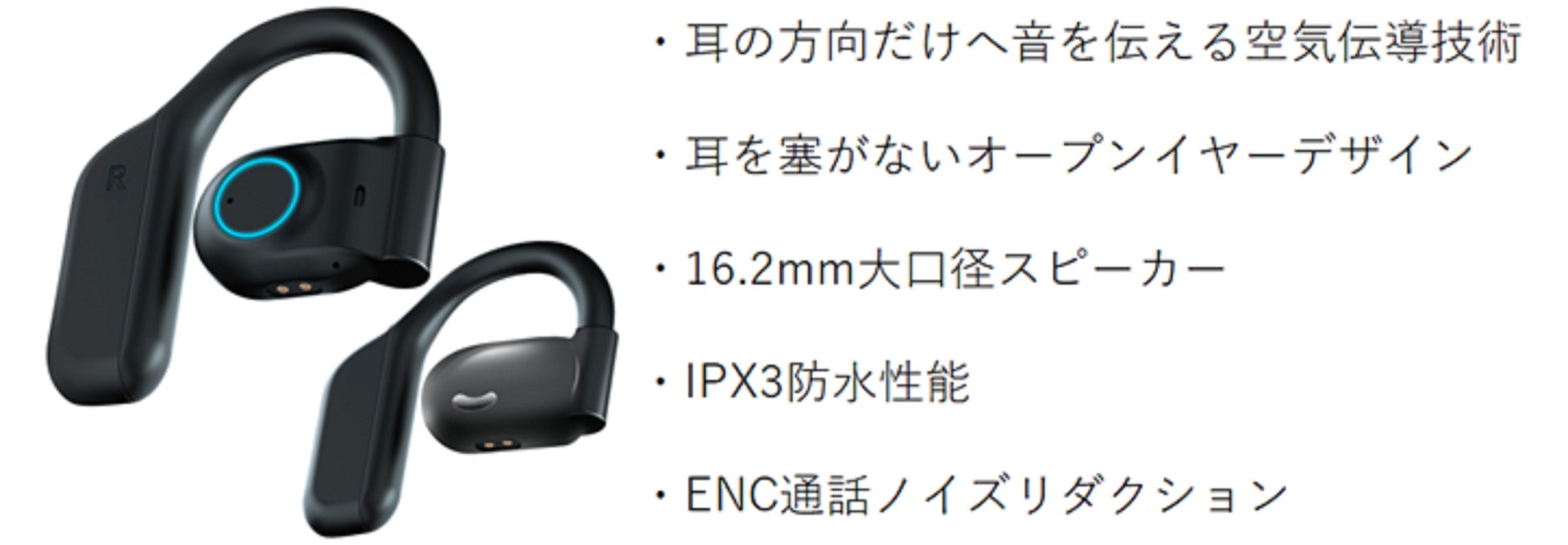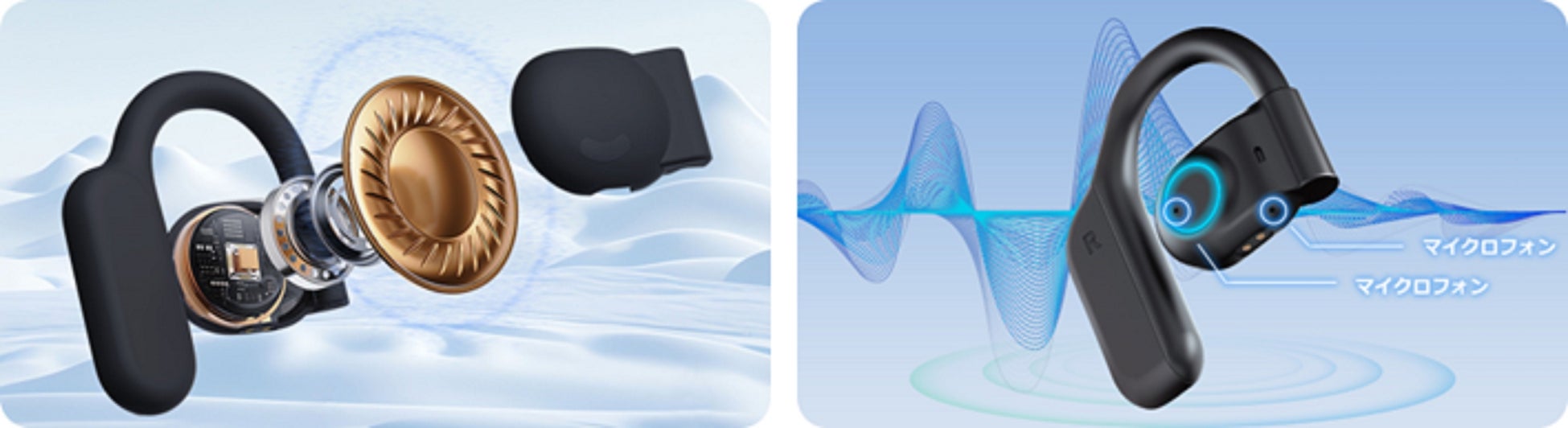【高音質な音楽再生と通話】ワイヤレスイヤホンとしては最大級の16.2mm口径ダイナミックドライバーを備え、高音から重低音までどの音域もクリアな音質でバランスよく再生します。また、独自技術によるデュアルマイクENCノイズリダクションシステムを搭載し、周囲の騒音を抑制、人の声を正確に捉えることで、通話相手にクリアでリアルな音声を伝えることができます。ゲームや動画視聴をする際には、音と映像のずれを抑えるための低遅延モードへの切り替えができます。オープンイヤータイプのイヤホンで気になる音漏れについては、指向性をコントロールする空気伝導技術により、周囲への音の拡散を抑制し音漏れを最大限抑えます。(構造上、基本的に音漏れを完全には防止できません。)